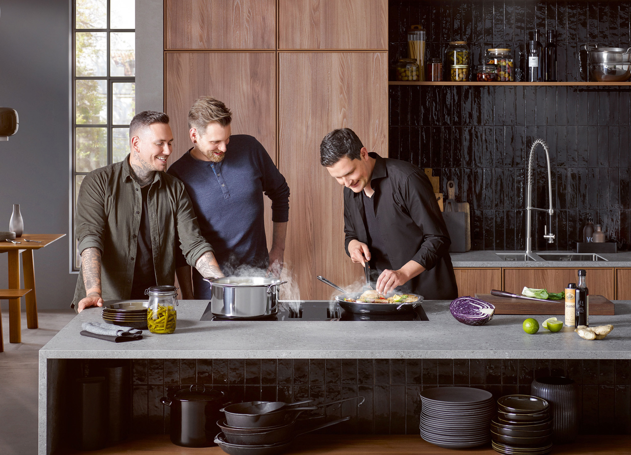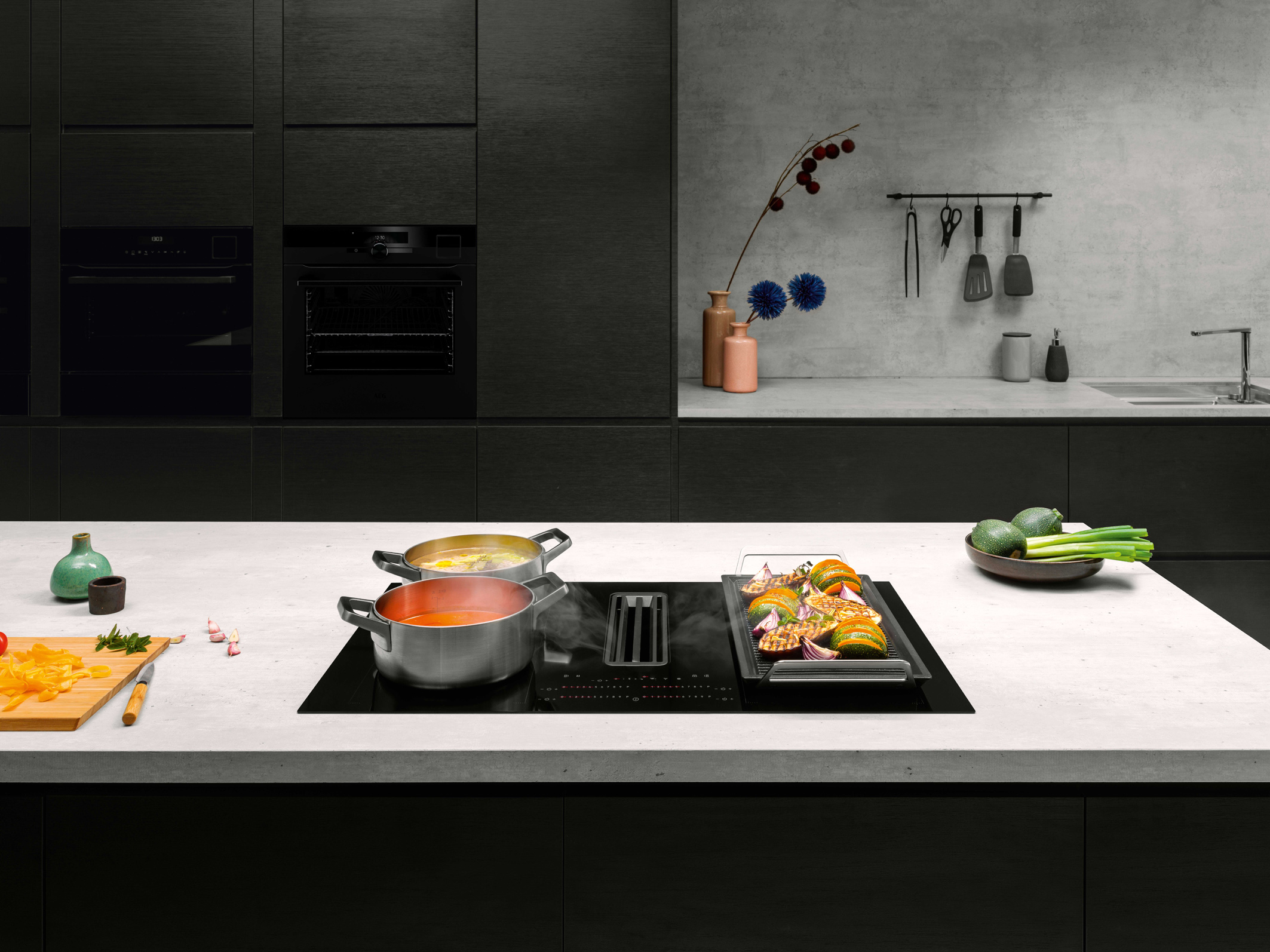 (Kitchen Innovation) Überzeugt in den Kategorien Funktionalität, Bedienkomfort, Innovation, Produktnutzen und Design: Die automatisierte Abzugsleistung entfernt Essensgerüche zuverlässig – das flexible Zusammenschalten der Kochzonen sorgt für besonders attraktive Kocherlebnisse. (Foto: AMK)