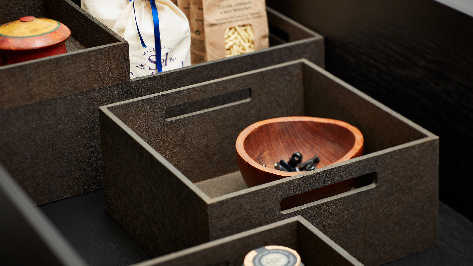 Heutzutage soll die Innenausstattung nicht nur schön sein, sondern auch nachhaltig wie z. B. diese hochwertige Lösung für Schubkästen und Auszüge. Sie besteht u. a. aus einem Verbundwerkstoff aus heimischen, schnell wachsenden Bastfasern und einem Bindemittel auf Wasserbasis. (Foto: AMK)
