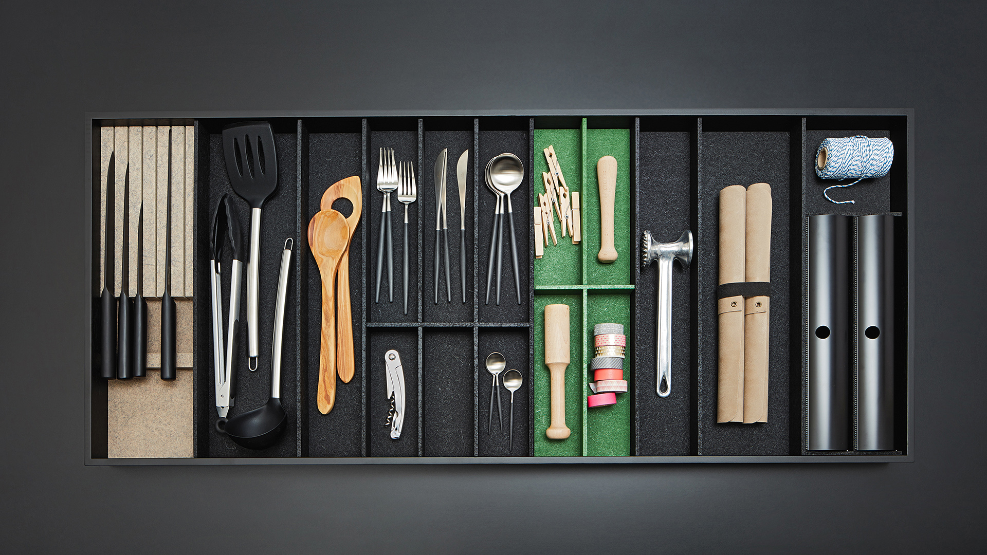 Angefangen bei der Planung der Unterschränke mit ihren individualisierbaren sowie hoch belastbaren Schubkastensystemen. Sowie den Auszügen mit ihren vielen schicken Ausstattungsvarianten – von zweckdienlich bis hochwertig und sehr elegant. Dass dies z. B. auch mit einem achtsamen und verantwortungsvollen Umgang mit unseren Ressourcen Hand in Hand gehen kann, zeigen neue nachhaltige Innenausstattungen für Schubkästen und Auszüge. Ein Repräsentant hierfür besteht u. a. aus zu knapp 70 Prozent schnell wachsenden, heimischen Bastfasern und einem Bindemittel auf Wasserbasis. Der mit einem Nachhaltigkeitspreis prämierte Verbundwerkstoff ist zudem sehr leicht, widerstandsfähig und lebensmittelverträglich. Nur wenige modulare Organisationselemente – wie ein Besteck- und Multifunktionseinsatz, breite und schmale Ausgleichsböden, eine Multifunktionseinheit und Einsteckstege – lassen sich hier einfach und unabhängig von den Schubladenbreiten nach dem Baukastenprinzip individuell arrangieren.    Â