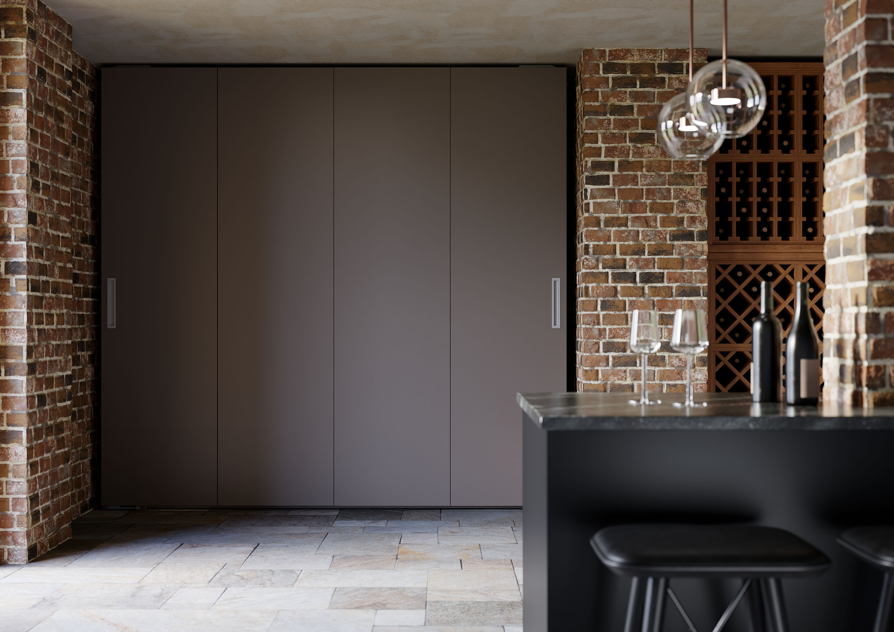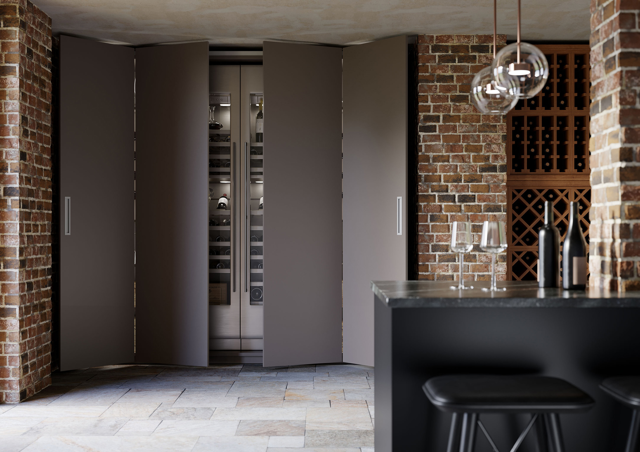 Wie sich eine perfekte Organisation hinter den Möbelfronten zudem noch wirkungsvoll inszenieren lässt, zeigt sich exemplarisch anhand der neuen Einschubtürsysteme (Pocket Doors). Je nach spontanem Bedarf gewähren sie einen vollen, partiellen oder überhaupt keinen Einblick auf das wohlgeordnete Innenleben dahinter. Mit Pocket Door Systemen lässt sich z. B. ein gut sortiertes Wein-Kabinett planen und auf Wunsch auch komplett verbergen. Ebenso eine große oder kleinere Küchenzeile oder ein in die Küche integrierter Homeoffice- oder Laundrybereich. Ein innovativer Mechanismus ermöglicht dabei die gleichzeitige Öffnungsbewegung von zwei miteinander verbundenen Türen. Je nach Ausführung des Pocket Systems werden sie einfach nur sichtbar zusammengeklappt oder ganz in den Möbelkorpus eingeschoben. Â
