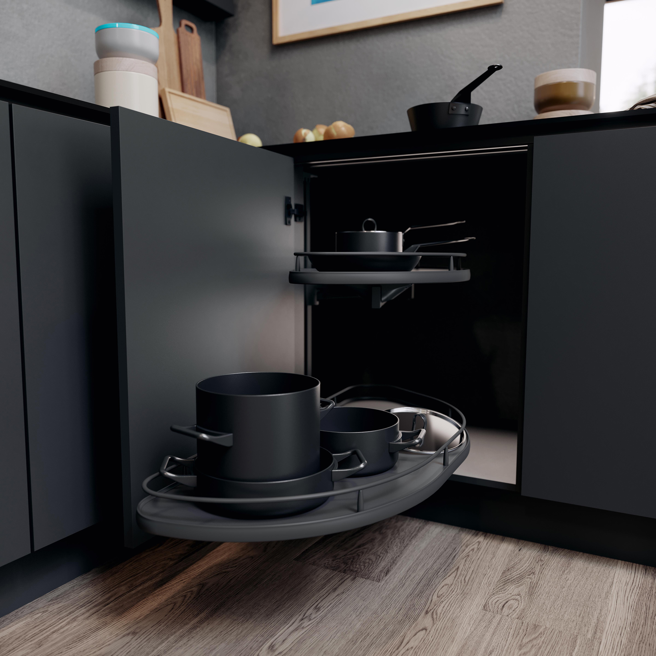 Nutzt den Platz in der „toten“ Küchenecke: Beim Öffnen des Eckschranks kommt der Inhalt auf den Tablaren voll entgegen ohne den Nachbarkorpus zu touchieren. Der rechts und links montierbare Eckschrankbeschlag kann in bereits vorhandene Unterschränke auch nachträglich eingebaut werden. (Foto: AMK)