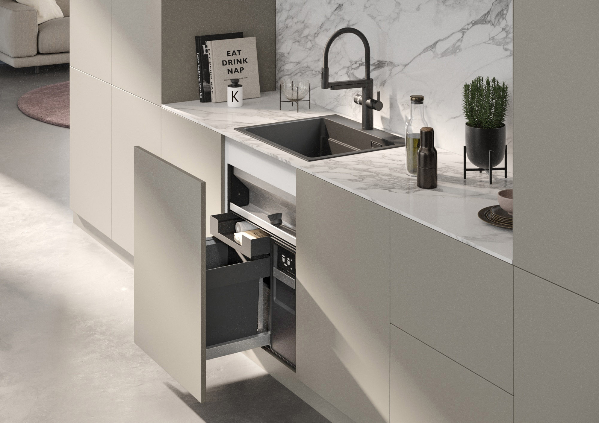 Bemerkenswert ist auch ein ganzheitlich aufeinander abgestimmtes und platzoptimiertes Ensemble aus einer Hand. Es besteht aus einem Spülbecken, einem Wassersystem – das kann eine herkömmliche oder multifunktionale Küchenarmatur für warmes/kaltes Leitungswasser sowie veredeltes Wasser sein, je nach Modell für gefiltertes, gekühltes, stilles, sprudelndes oder kochend heißes – und einer passenden Abfalllösung. Sämtliche Einzelkomponenten für den Unterschrank sind so konzipiert, dass sie den Platz darin bestmöglich nutzen. Für eine einfache Montage und sichere Fixierung aller Komponenten inklusive Schläuche, Kabel und Steckdosen sorgt ein stabiler Stahlrahmen, der alles aufnimmt. Beispielsweise ein komplettes Soda-Wassersystem für gefiltertes und gekühltes Sprudelwasser inklusive Filter, Sprudel- und Kühlsystem. Dazu ein passgenaues Abfallsystem inklusive einer Schublade mit gedämpftem Selbsteinzug plus einer weiteren Ablage zum Organisieren von Putzutensilien.