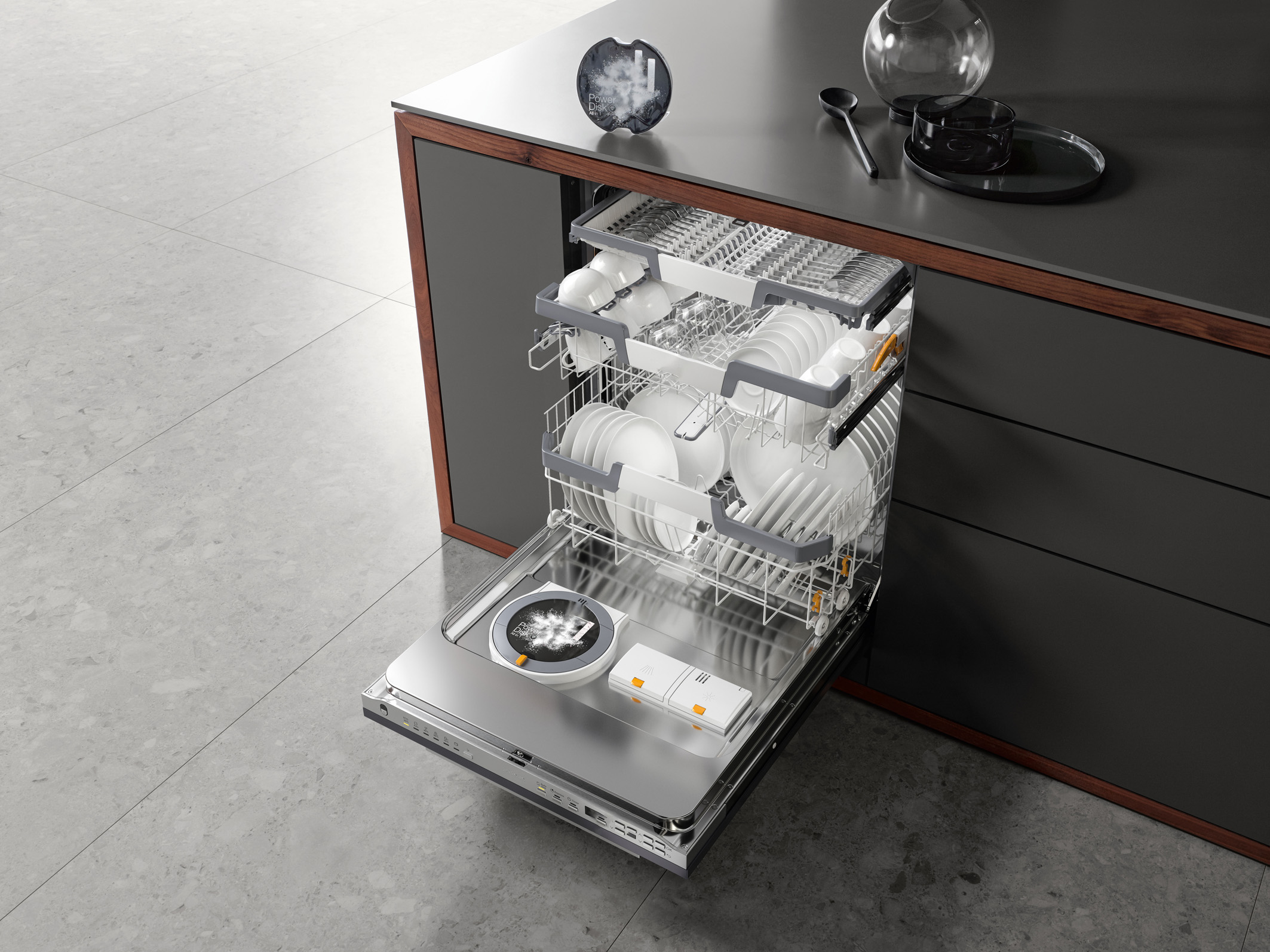 Hinzu kommen weitere Annehmlichkeiten wie z. B. eine Touchbedienung, Teleskopauszüge mit Leichtlauffunktion für ein schnelles Be- und Entladen, eine Startzeitverzögerung und ein Maschinenpflegeprogramm. Die Möglichkeit zu separatem Ober- oder Unterkorbspülen und eine dritte, nachrüstbare Beladungsebene für Kleinteile und Besteck. Bei grifflosen, vollintegrierten Geschirrspülern erfolgt das Türöffnen durch sanftes Antippen der Möbelfront. Der Programmstatus wird mittels eines LED-Spots auf dem Küchenfußboden unterhalb des Einbaugeräts angezeigt. Bei Programmende erlischt er – der Spüler kann jetzt ausgeräumt werden. Ein wichtiger Benefit, von dem insbesondere offen geplante Lifestyle-Wohnküchen profitieren, ist flüsterleises Spülen zwischen 37 und 41 Dezibel dank moderner, energiesparender Inverter-Motoren.