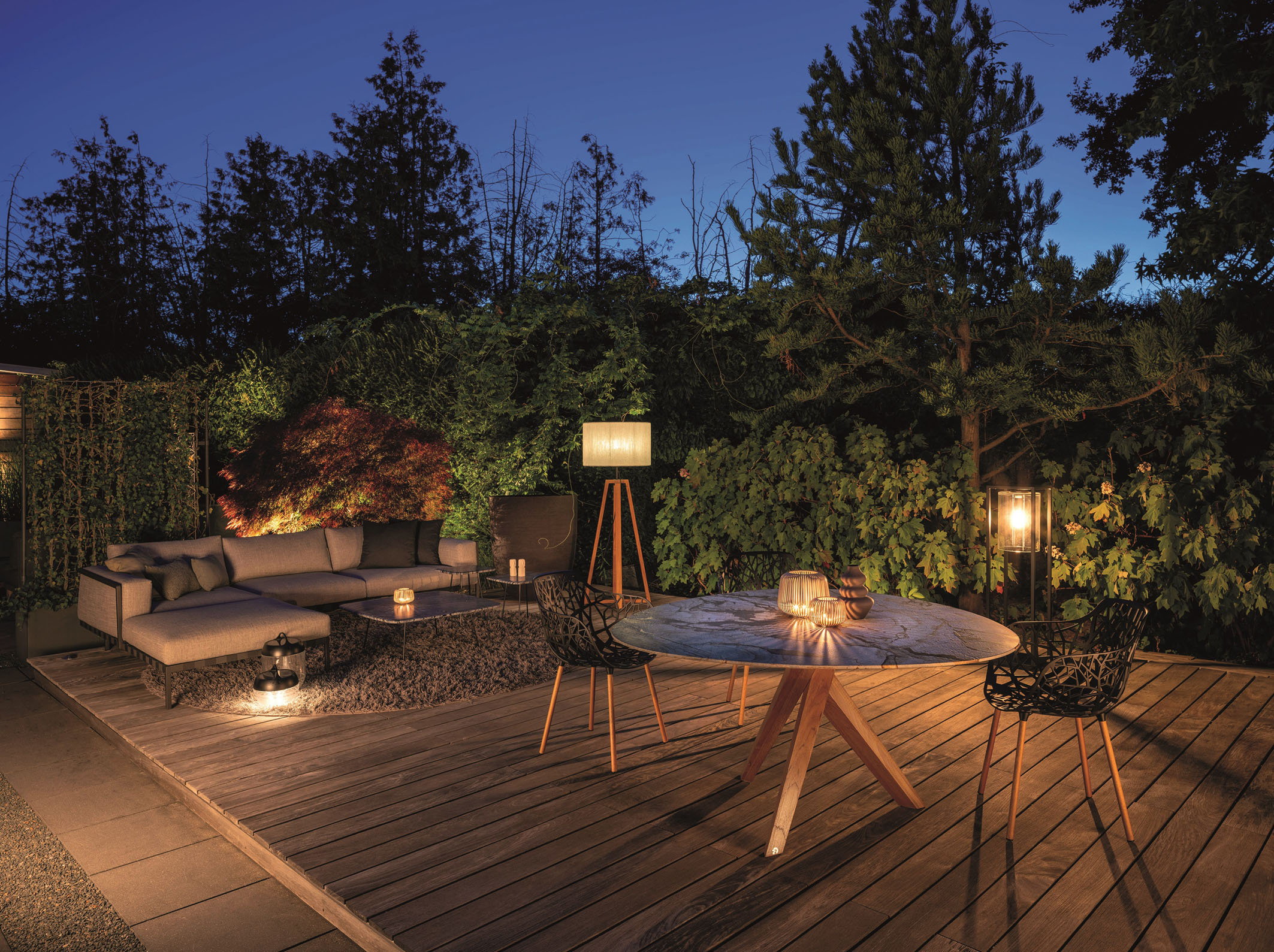 Das Leben wird vermehrt ins Freie verlagert, daher soll es draußen immer wohnlicher und gemütlicher werden – sei es auf dem kleinen Balkon oder der großzügigen Terrasse. Das Design des Außenbereichs gleicht sich dem der Innenräume immer stärker an. Die Möbel für draußen stehen der Einrichtung für die Innenräume in nichts nach. Manches Outdoor-Möbel kann genauso gut im Ess- oder Wohnzimmer stehen und wird zum Herbst hin tatsächlich hereingeholt. Zur Wohlfühl-Atmosphäre tragen auch Outdoorteppiche, Outdoor-Sitzsäcke, Überdachungen, große Sonnenschirme oder -segel, LED-Leuchten, Lichterketten, Kerzen, Kissen, Decken, Bluetooth-Lautsprecher und schöne Pflanzgefäße bei. Die Auswahl an Wohn-Accessoires für draußen ist überaus groß.