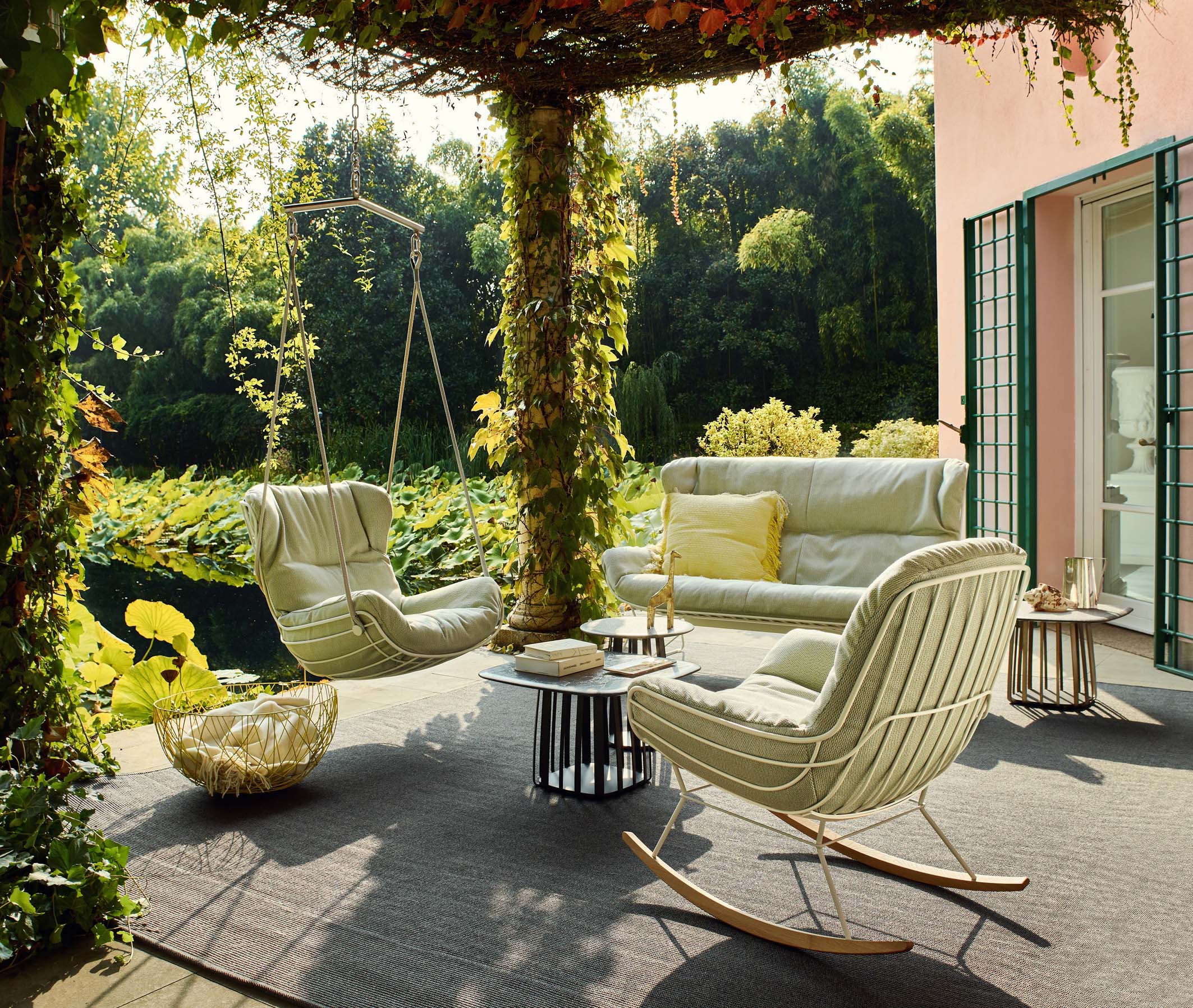 Als besonders behagliche Rückzugsoase dienen Daybeds. Die bequemen, extra breiten Outdoor-Betten verfügen häufig über eine feste Überdachung oder sind in Muschelform mit ausklappbarem Sonnensegel gestaltet. Im Trend liegen zudem Hängesessel, Schaukelstühle und Strandkörbe.