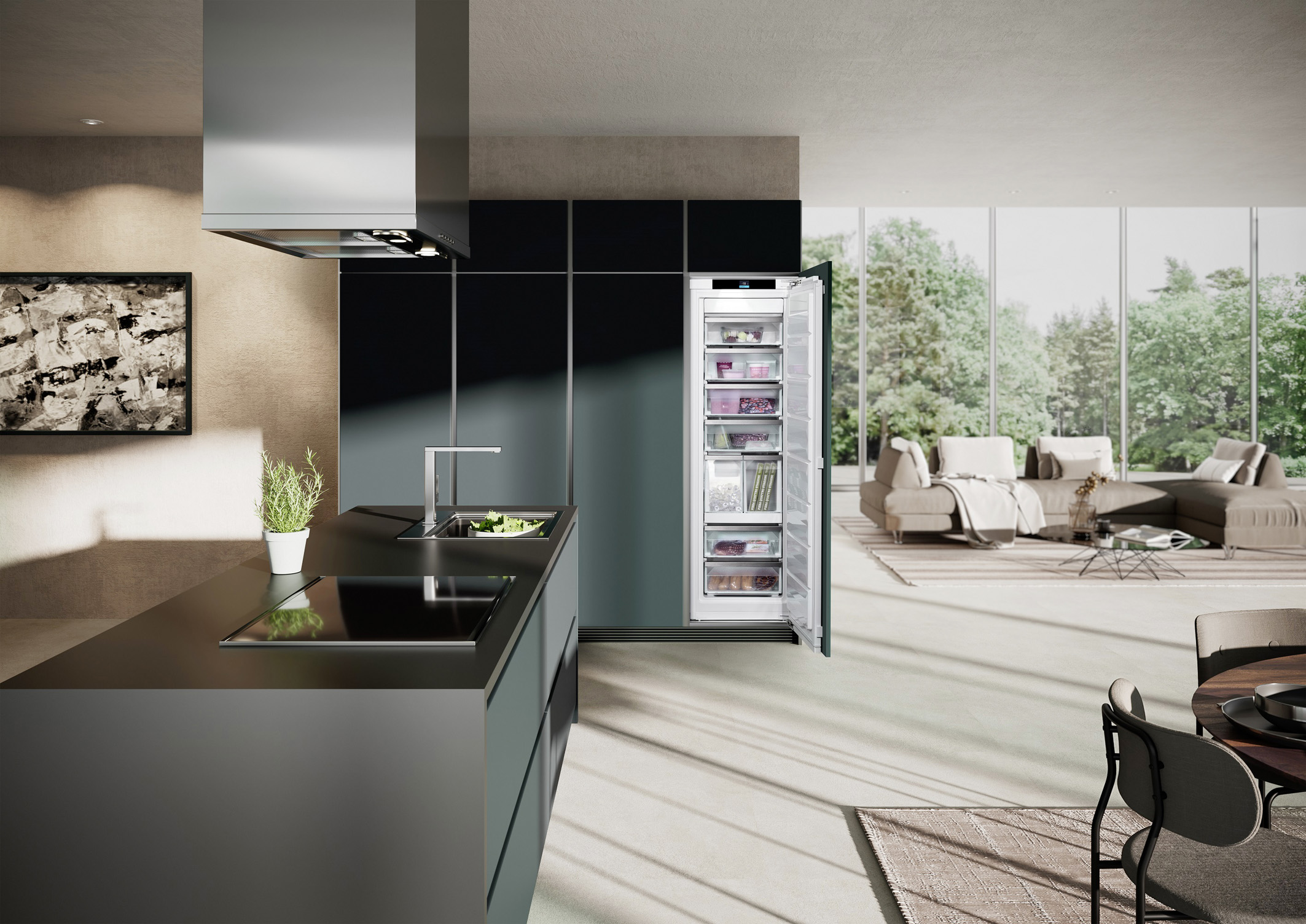 Geräteintelligenz steckt in jedem Detail. Dieser NoFrost-Gefrierschrank lässt sich vollständig automatisch öffnen und schließen – z. B. per Klopfsignal auf die Außen- und Innentür oder per Sprachsteuerung in der App. (Foto: AMK)