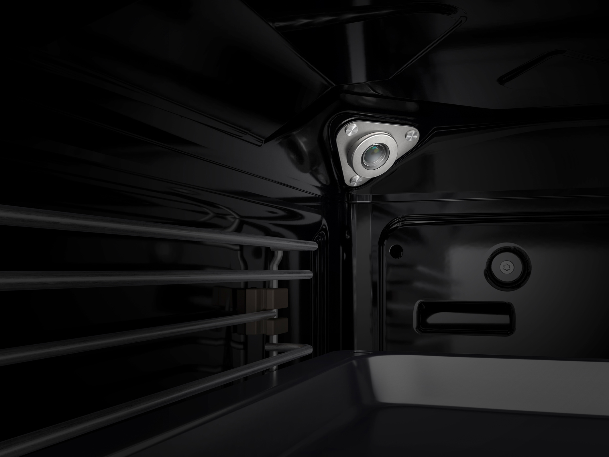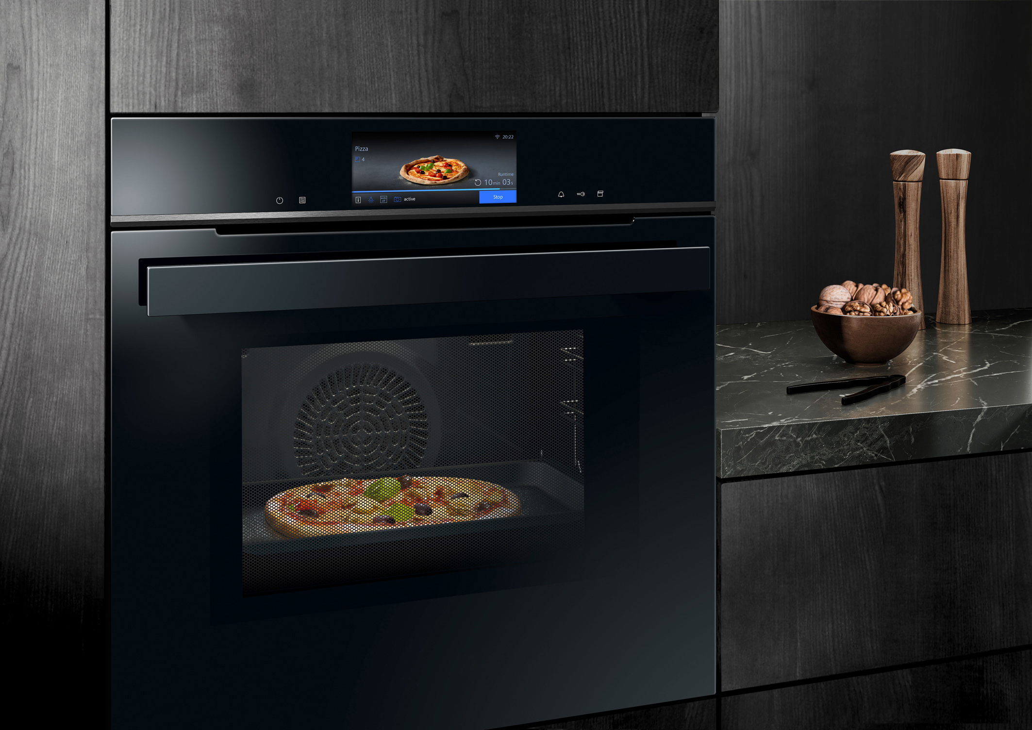 HighTech-Backofen, ausgestattet mit einem Annäherungssensor, Künstlicher Intelligenz, Kamera, kabellosen Temperaturfühler sowie einem XXL-Touch-TFT-Screen, der sich über die gesamte Backofentür erstreckt. (Foto: AMK)