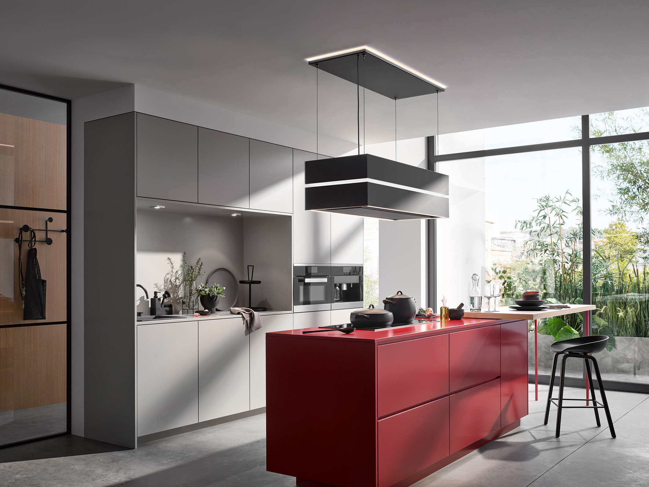 Kochen und Braten mit diesem extrabreiten Premium-Induk¬tions¬kochfeld mit integrierter Haubensteuerung und dazu eine Design-Deckenlifthaube. Beim Einschalten des Kochfelds startet die Inselhaube automatisch. (Foto: AMK)