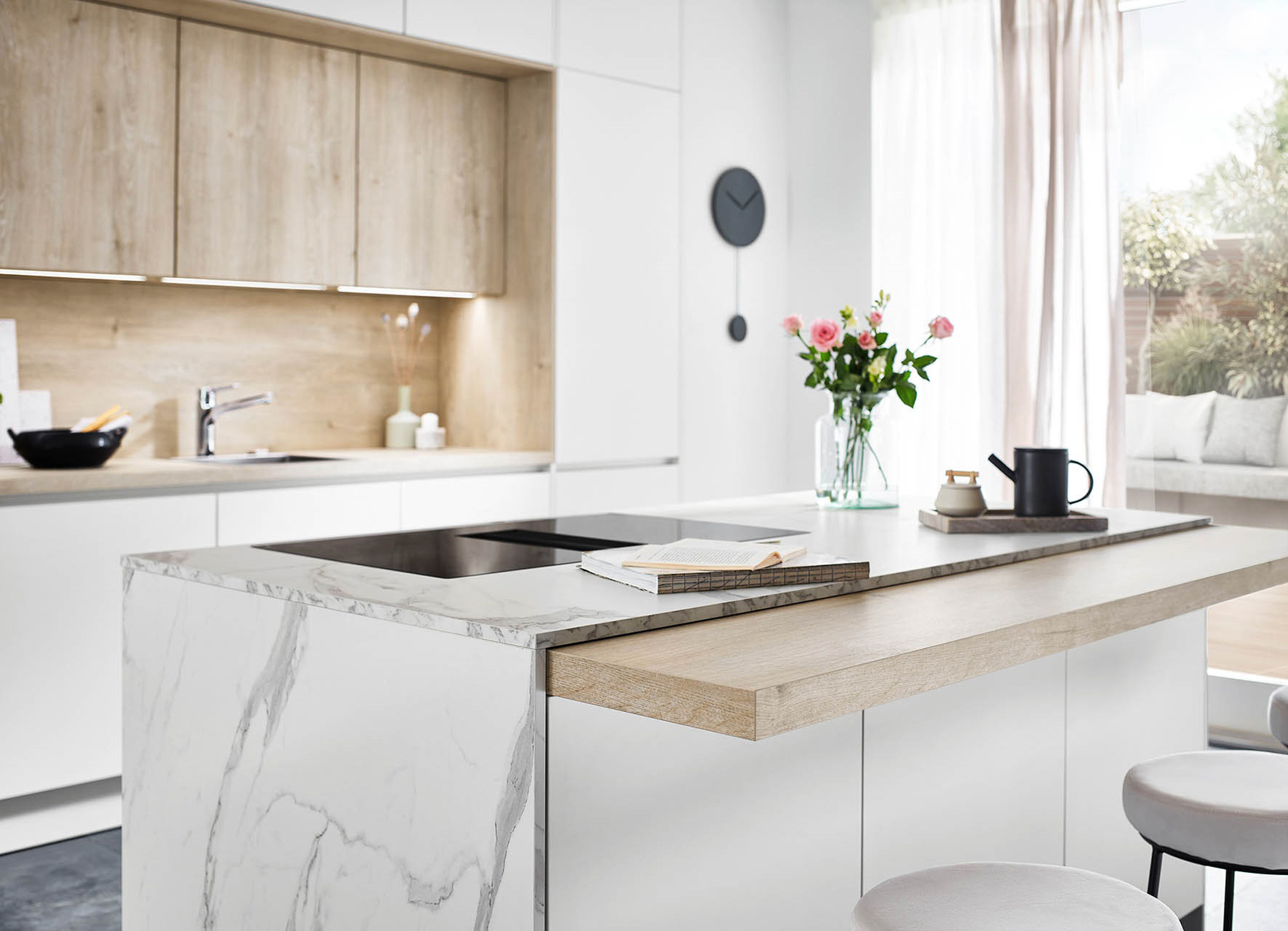 Wohnküche im angesagten Japandi-Style, eine Kombination aus skandinavischem und japanischem Einrichtungsstil. Hier in einem wohnlichen Mix aus astigem, sehr naturgetreuem Eichefurnier mit glatter Oberfläche sowie mit trendstarken vertikalen Nuten, kombiniert mit Marmor-Optik in Greige. (Foto: AMK)