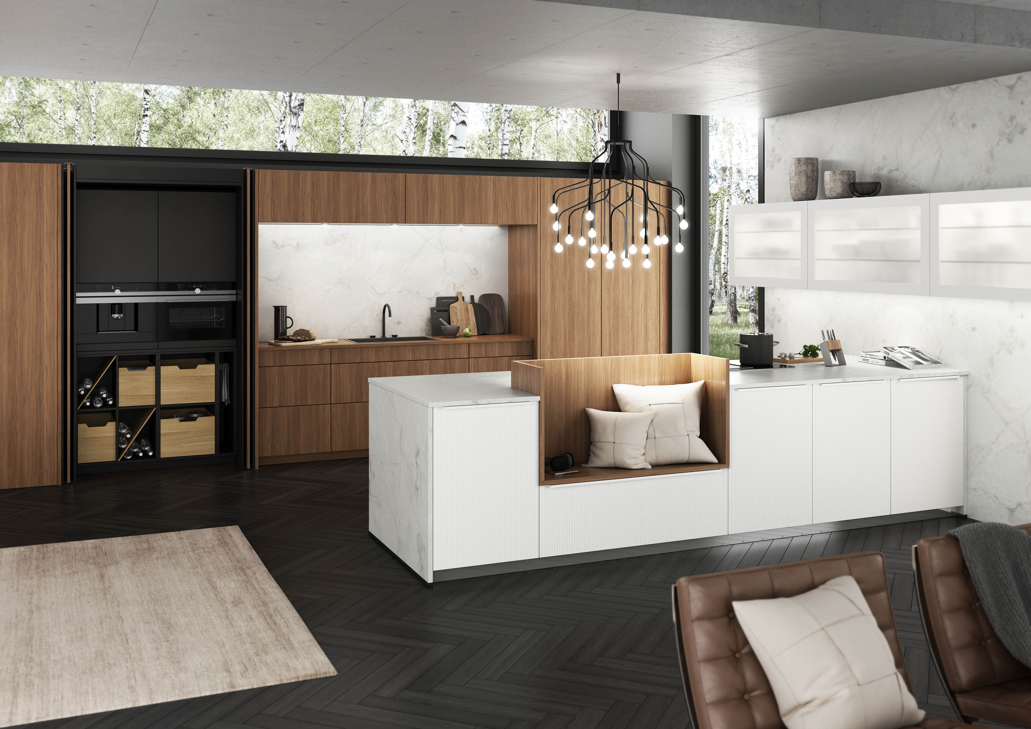 Ein Traum in Nussbaum, Weiß seidenmatt und Marmor. Die weißen Rillenfronten mit ihren feinen, farbgleichen Griffleisten bilden einen schönen Kontrast zum eleganten Nussbaum-Furnier und Akzenten in Marmor (Dekor). Ein weiterer Eyecatcher sind die komplett einschiebbaren Pocketdoors. (Foto: AMK)