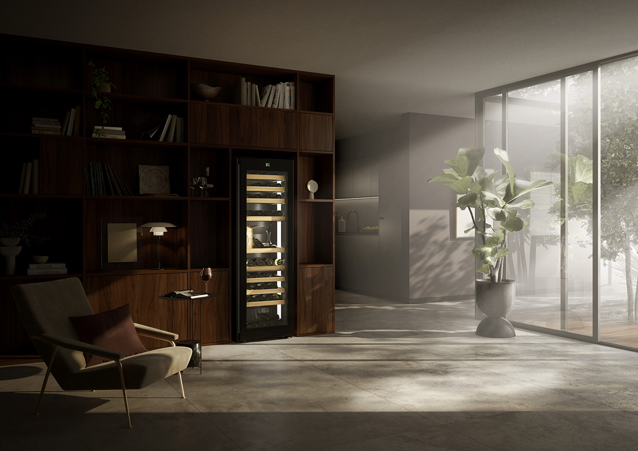 Integrierter Weinlagerschrank für eine perfekte Weinbevorratung mit erschütterungsfreier Lagerung, Schutz vor UV-Strahlen und Fremdgerüchen, optimaler Luftfeuchte sowie individuell einstellbaren Temperaturzonen. (Foto: AMK)