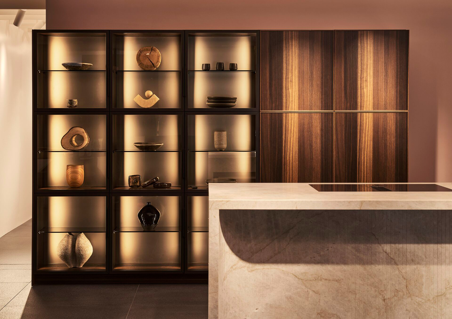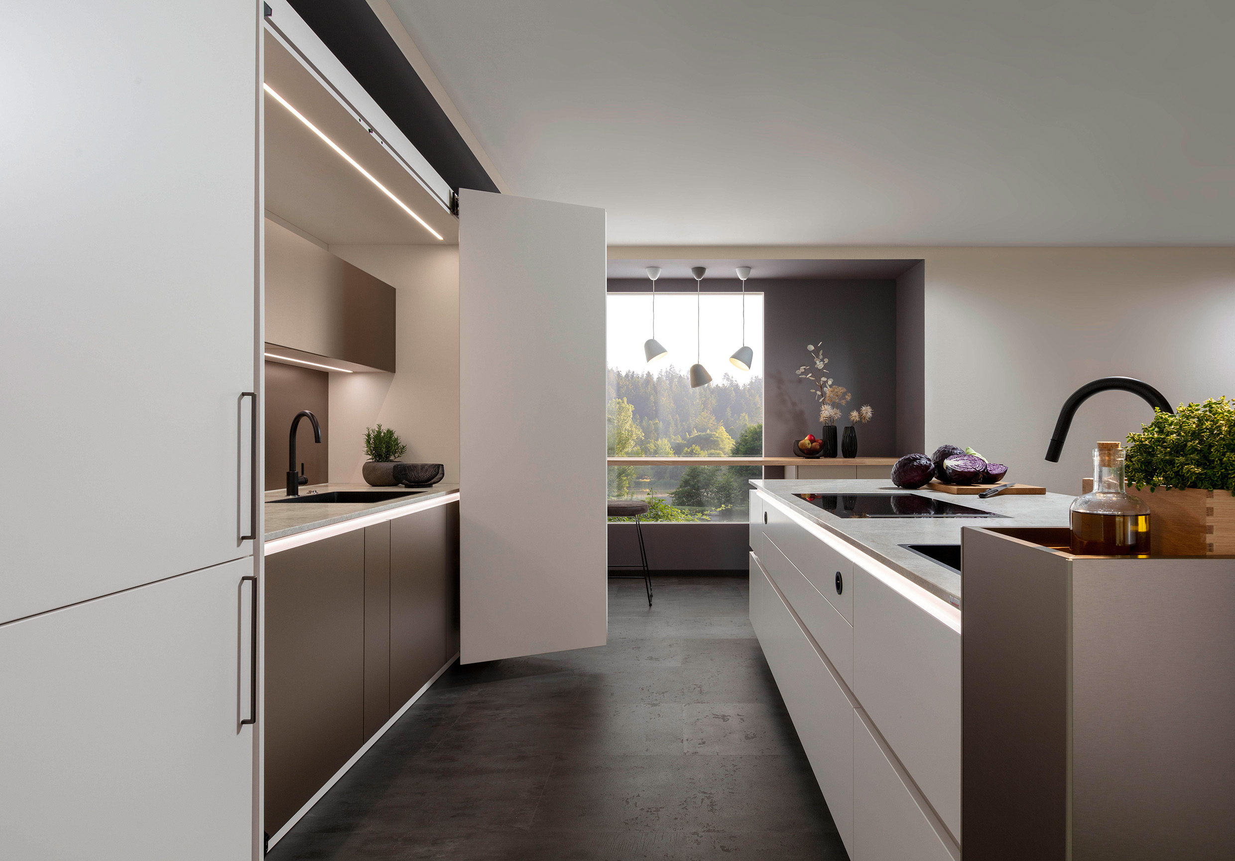 Hell, freundlich und fein akzentuiert mittels dezenter Lichtquellen wie zum Beispiel ein beleuchtetes Griffprofil in der Kücheninsel sowie schmale LED-Stripes im Arbeitsbereich, der sich mit Pocketdoors komplett verschließen lässt. (Foto: AMK)Â