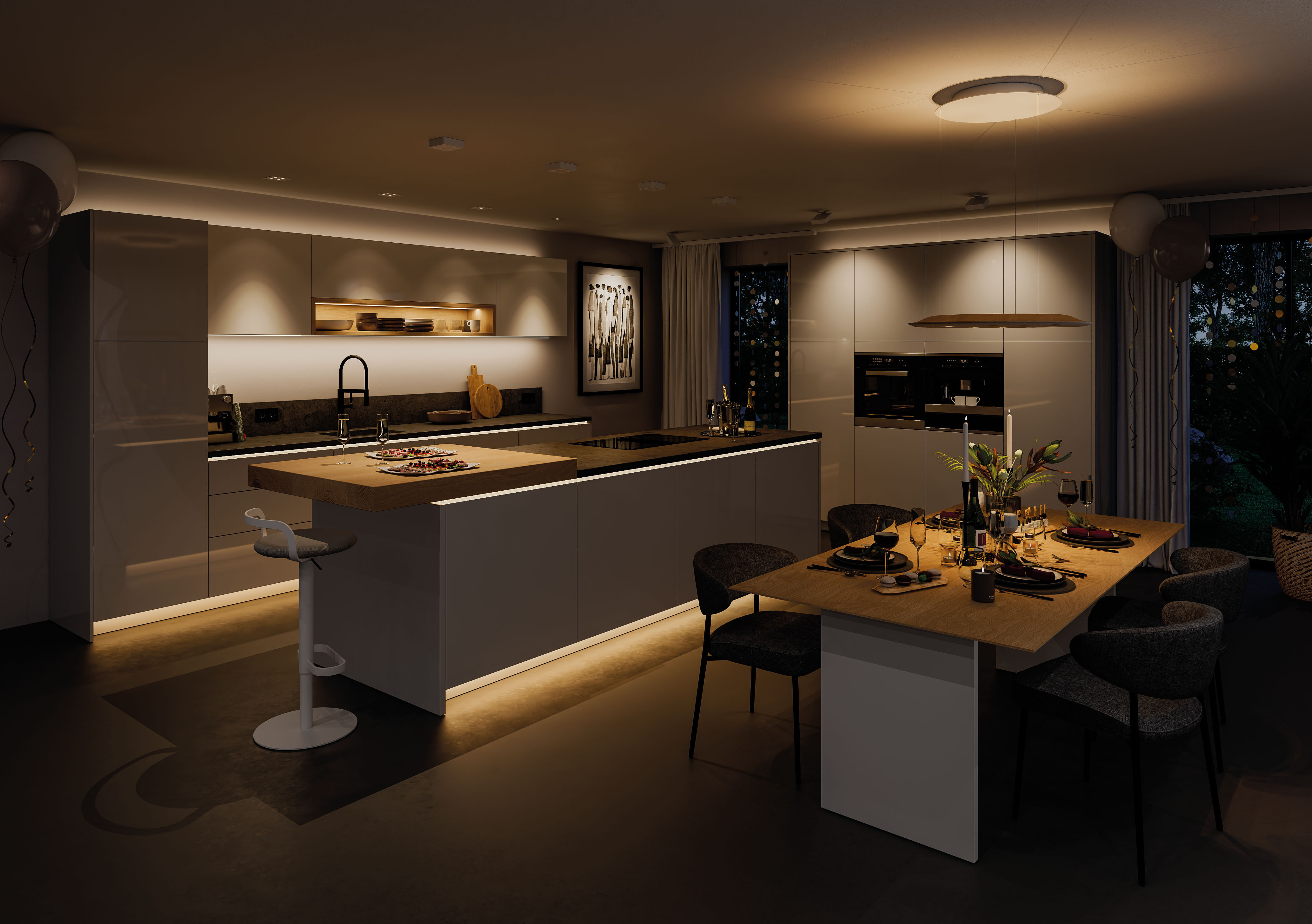 Raumlicht, Arbeitslicht, Hintergrundlicht, Entspannungslicht, Sicherheitslicht – innovative Lichtsysteme erfüllen in einer (Wohn-)Küche heute die unterschiedlichsten Aufgaben: als dezent-helles Raumlicht, um nach dem Aufstehen angenehm in den Tag zu starten. Als konzentrationsförderndes, kaltweißes Arbeitslicht im Bereich Arbeitsplatte und Spüle, ohne dass es bei der Essensvor-/-zubereitung blendet oder Schatten wirft, was die Augen schnell belasten und ermüden würde. Als stimmungsvolles Candlelight am Abend oder anregendes Party-Licht in der Wohnküche. Sowie in Form einer dezenten Hintergrundbeleuchtung während des Fernsehens, als beruhigendes Wohlfühllicht zum Entspannen oder auch als sicheres Nachtlicht für stolperfreie Wege – dauerhaft oder ausgelöst per Bewegungsmelder.