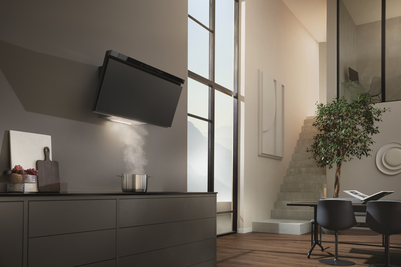 Selbst wenn erst noch andere Handgriffe zu erledigen sind, lassen sich die WLAN-fähigen Kochfelder schon einmal per Sprachbefehl starten. Dank der Kommunikation der Geräte untereinander aktiviert sich auch die Dunstabzugshaube, sobald mit dem Kochen begonnen wird. Über das Kochfeld kann die Abluftleistung gesteuert werden, mit der App lässt sich aus einer breiten Auswahl die gewünschte Lichtfarbe an der Abzugshaube aussuchen. Damit der Inhalt des Kochtopfs nicht mehr überkocht, misst ein im Kochfeld verbauter Sensor die Temperatur im Inneren des Tops und sorgt dafür, dass die gewünschte Temperatur gehalten wird. Wer unsicher ist, ob die Kochfelder auch wirklich ausgeschaltet sind, kann sich von unterwegs über die App vergewissern.