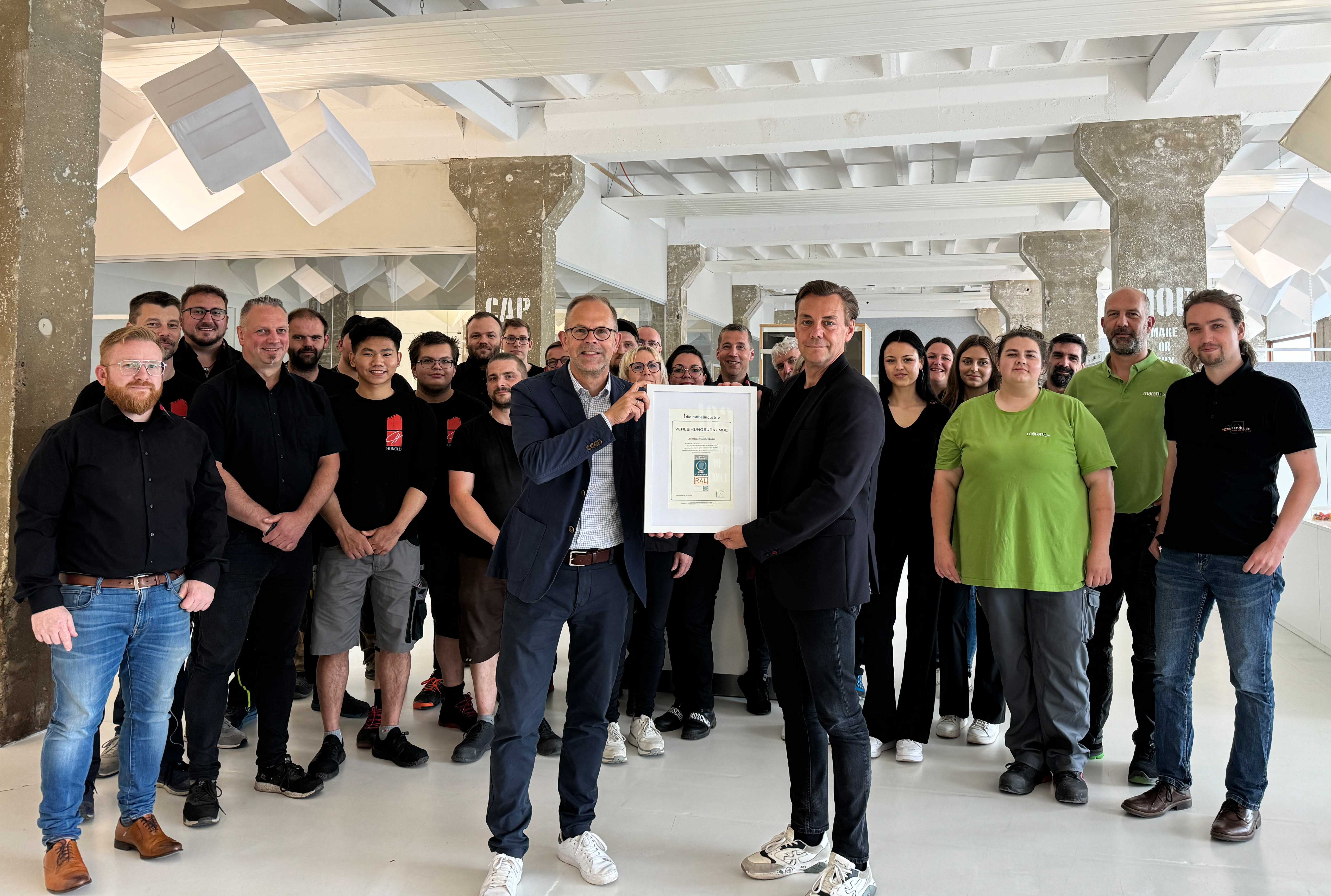 Rund 90 Prozent seines Strombedarfs deckt Ladenbau Hunold durch die eigene Photovoltaikanlage. Der Mittelständler setzt zudem auf die Nutzung von Bestandsimmobilien und die Aufbereitung gebrauchter Einrichtungen „Das Herkunftslabel ‚Möbel Made in Germany‘ bietet uns die Möglichkeit, die Hochwertigkeit und Langlebigkeit unserer Möbel zu unterstreichen“, sagte Gründer und Geschäftsführer Christian Hunold bei der Urkundenübergabe durch Jan Kurth, Geschäftsführer der Verbände der deutschen Möbelindustrie.