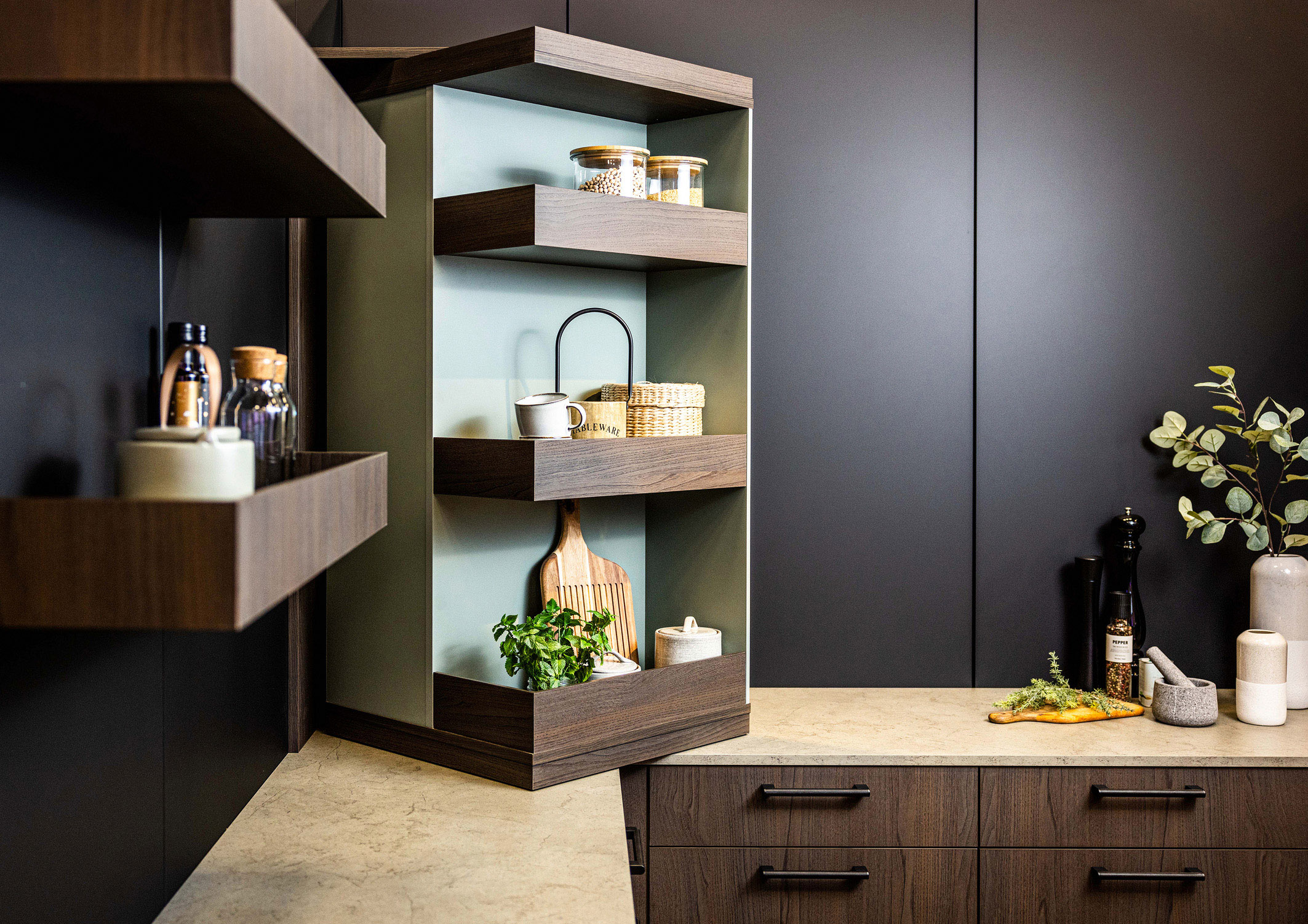 Wie sich nicht so leicht zugängliche Bereiche in Hoch-, Ober- und Unterschränken optimal und komfortabel nutzen lassen, demonstriert ein neues, robustes Metalltablar in verschiedenen Designausführungen und mit einer Traglast von bis zu 20 kg. Es lässt sich sowohl leicht ausziehen als auch um 360 Grad drehen. Außerdem kann es in jedem 60 cm breiten Schrank nachgerüstet werden, zum Beispiel im Hochschrank über dem Einbau-Backofen.