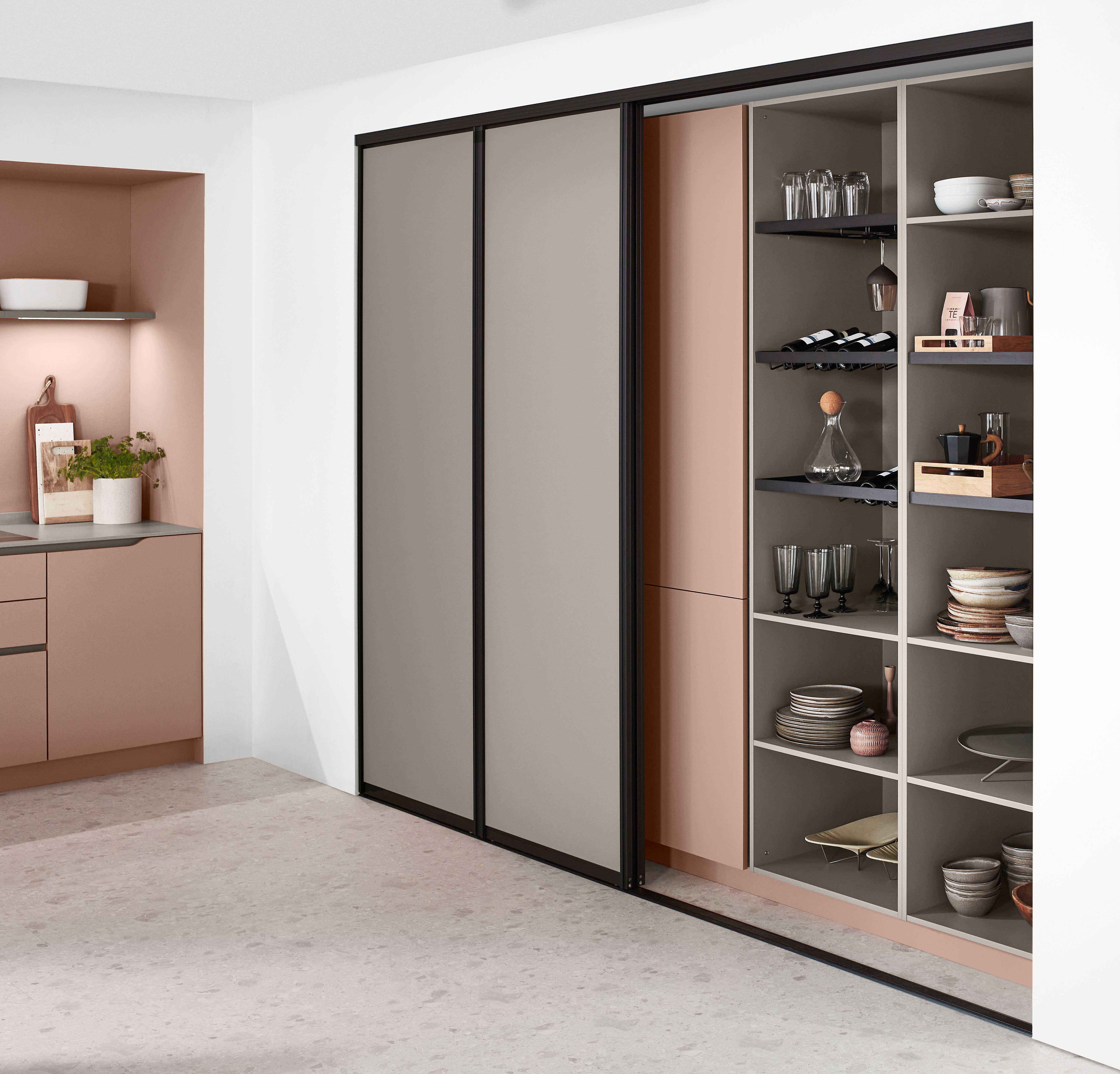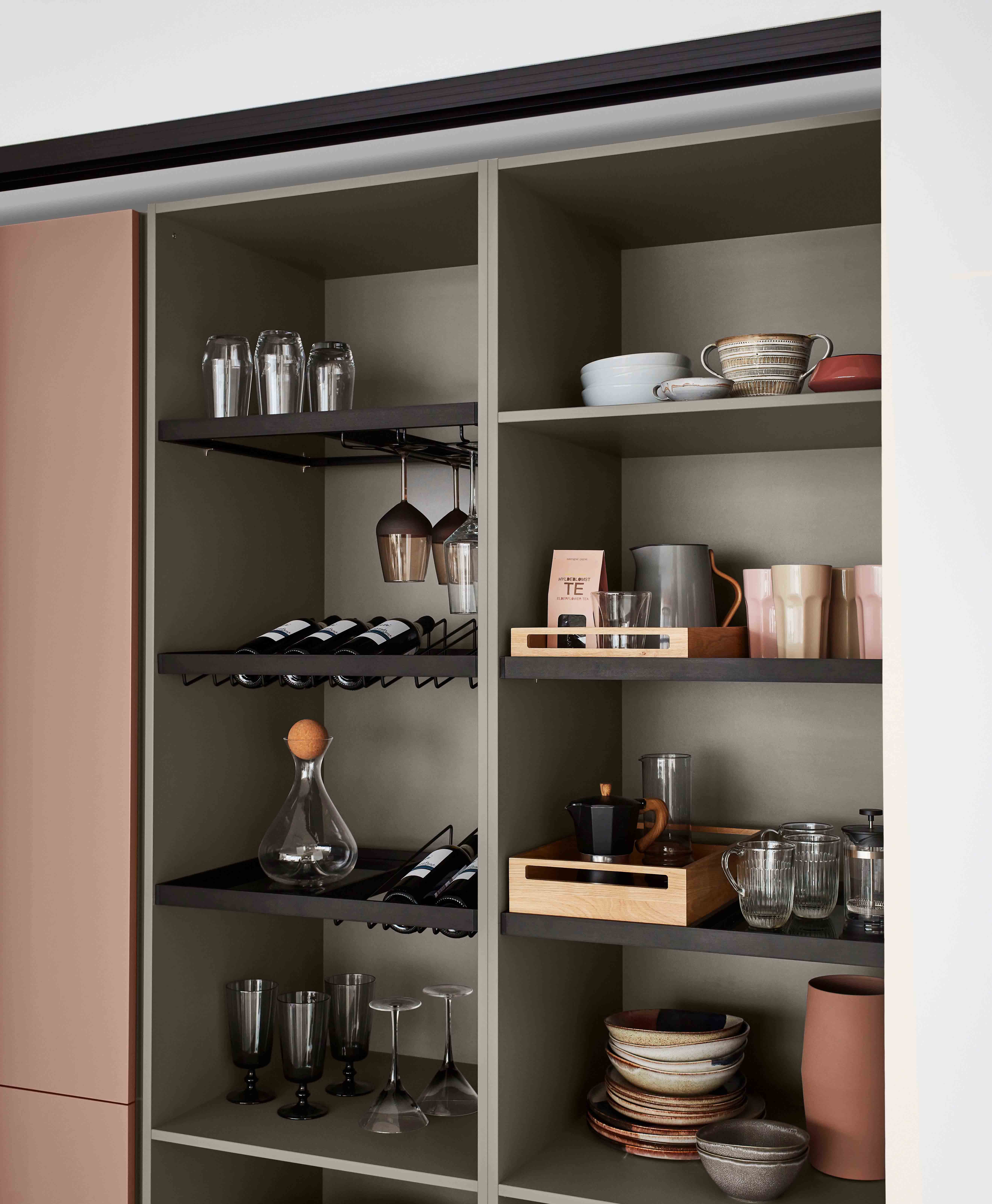 Beliebt und darüber hinaus sicher sind (extra)hohe Gleittüren oder Einschubtüren – in den Korpus vollversenkbare Pocketdoors –, da sie nicht im Wege stehen. Dahinter begeistern neue Regalkonzepte mit zusätzlichen Funktionen wie Designböden aus Holz, Glas und Metall, die beliebig miteinander kombiniert werden können. Beispielsweise zu einem kleinen Sommelier-Center mit Flaschenregalen, Halterungen für langstielige Weingläser und einem Dekantierbereich. Â