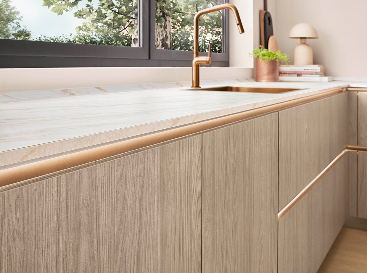 Bild 1a: Trend Bronze und Details mit großer Wirkung. So lassen sich exklusive Akzente setzen wie mit dieser schönen Küchenarbeitsplatte in Marmor Carrara Bronze-Optik. Die fein abgestimmten Griffmulden sowie die Spüle und Armatur in Bronze kommen im hellen Ambiente besonders schön zur Geltung. (Foto: AMK)