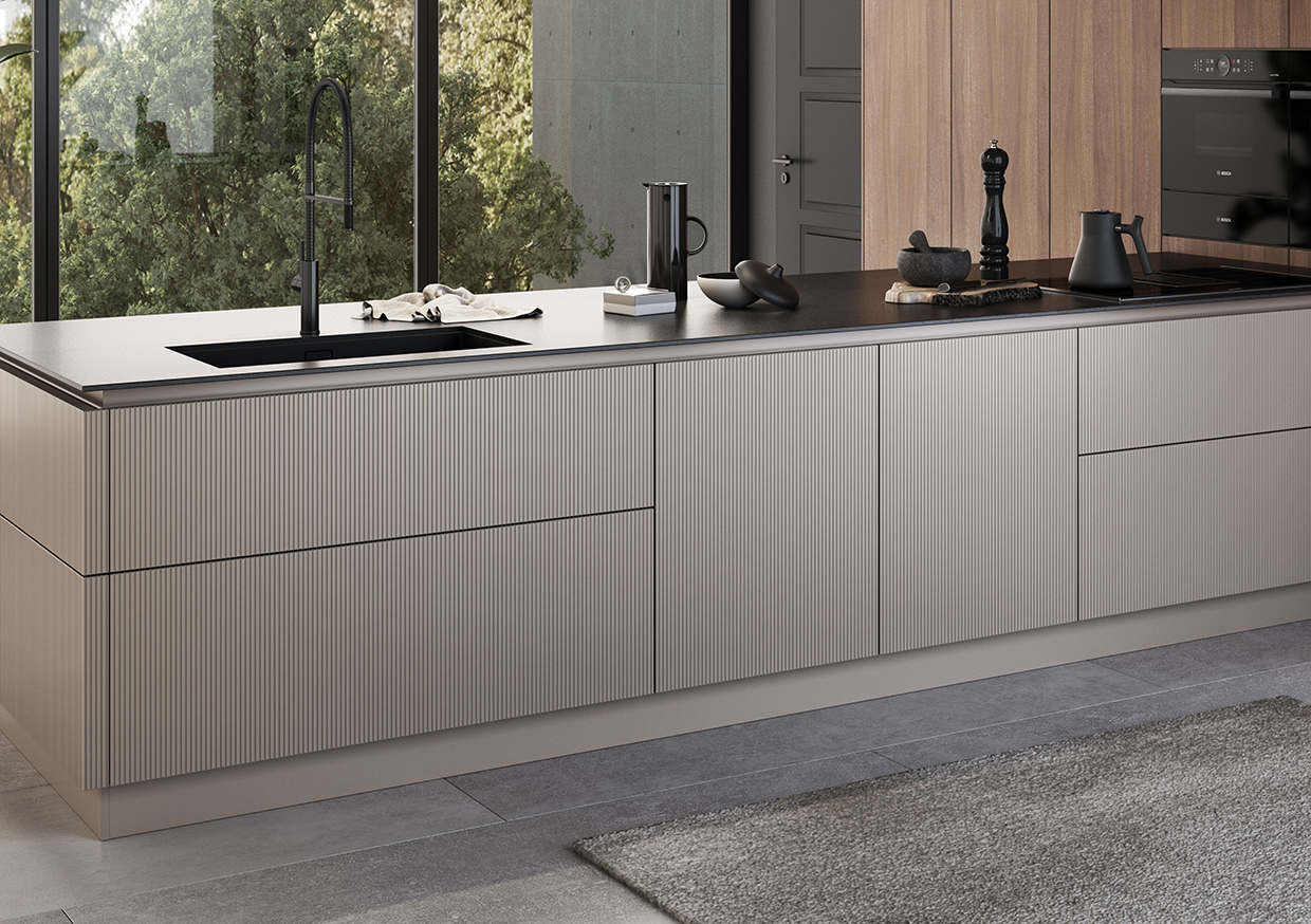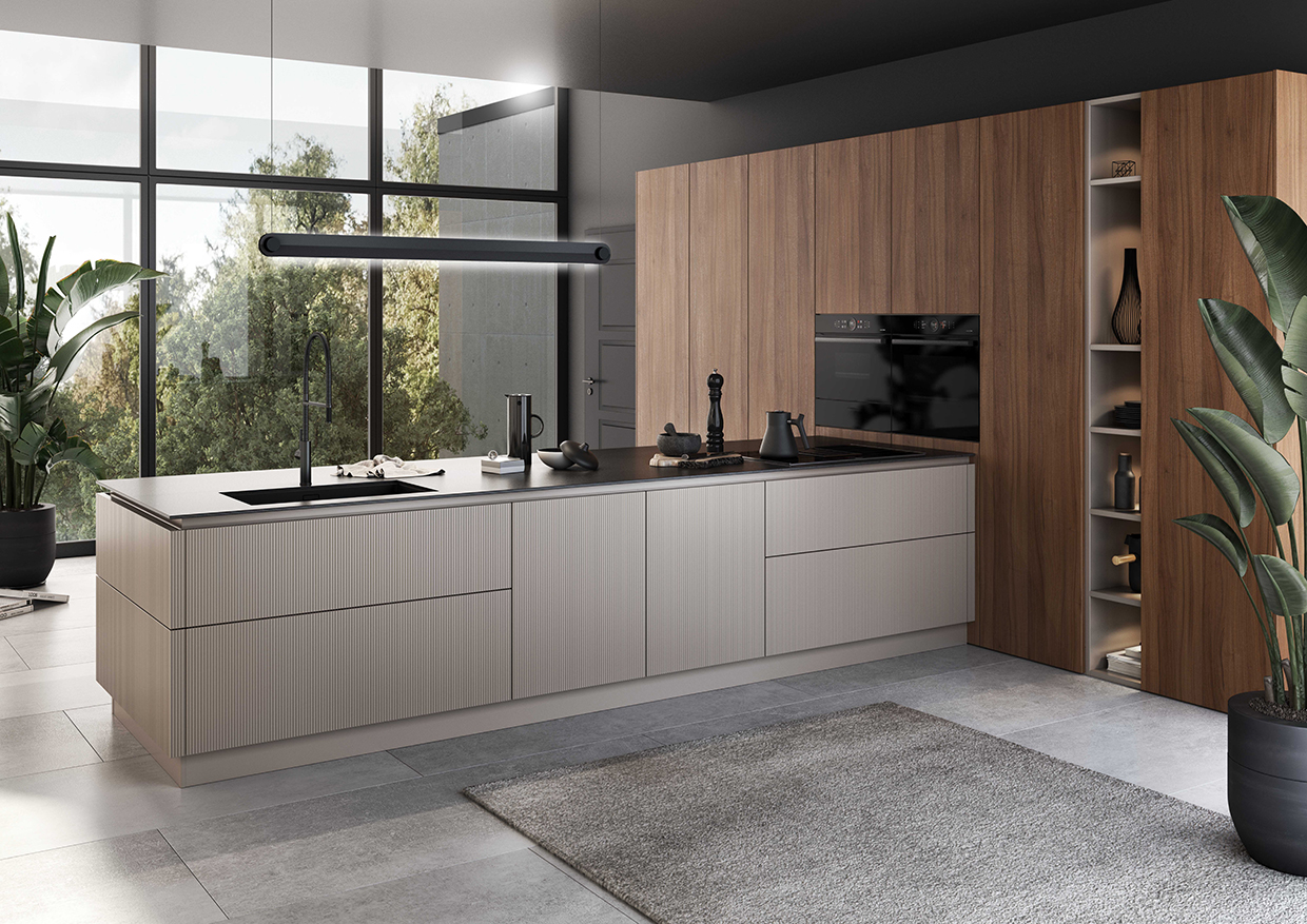Bild 2a: Glatte Holzfurnierfronten in Nussbaum mit senkrecht verlaufender Maserung und Greige-farbene Oberflächen mit Rillenoptik bei der Insel machen den Reiz dieser Grifflos-Planung aus. Ein Premium-Schutzlack macht das Furnierholz unempfindlicher gegen Feuchtigkeit, Schmutz und Kratzer. (Foto: AMK)