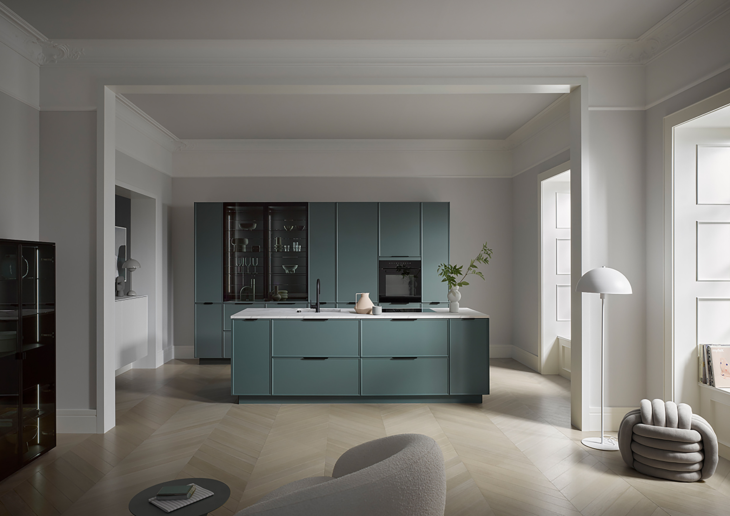 Bild 3: Hochwertige Materialien, ein außergewöhnlicher Farbton, der extrem schmale Rahmen der Kassettenfronten von nur 10 Millimetern sowie die integrierte Vitrine mit hochwertigem Parsolglas machen diese Wohnküche zu einem Masterpiece und schaffen eine ruhige und entspannte Atmosphäre. (Foto: AMK)