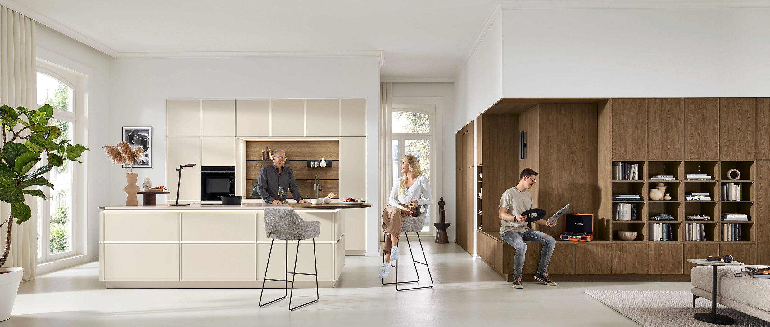 Bild 4: Modern und gemütlich wirkt diese grifflose Küchen- und Wohnlandschaft mit ihrem minimalistisch-klaren Design und den feinen, schmalen Rahmenfronten. Der von der Natur inspirierte zarte Farbton erinnert an helle Muscheln und harmoniert ausgezeichnet mit den dunkleren Eichenholz-Fronten. (Foto: AMK)Â