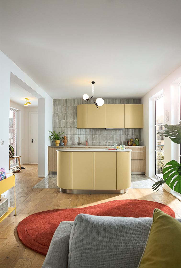 Bild 7: Ein faszinierender Mix aus Moderne und Retro, eckigen und sanft gerundeten Formen, seidigmatten, glatten Oberflächen in einem sonnigen Gelb und gerillten Fronten in Eiche- natur-Nachbildung. Diese Wohlfühl-Wohnküche benötigt mit ihrer platzsparenden Formgebung nicht viel Grundfläche. (Foto: AMK)