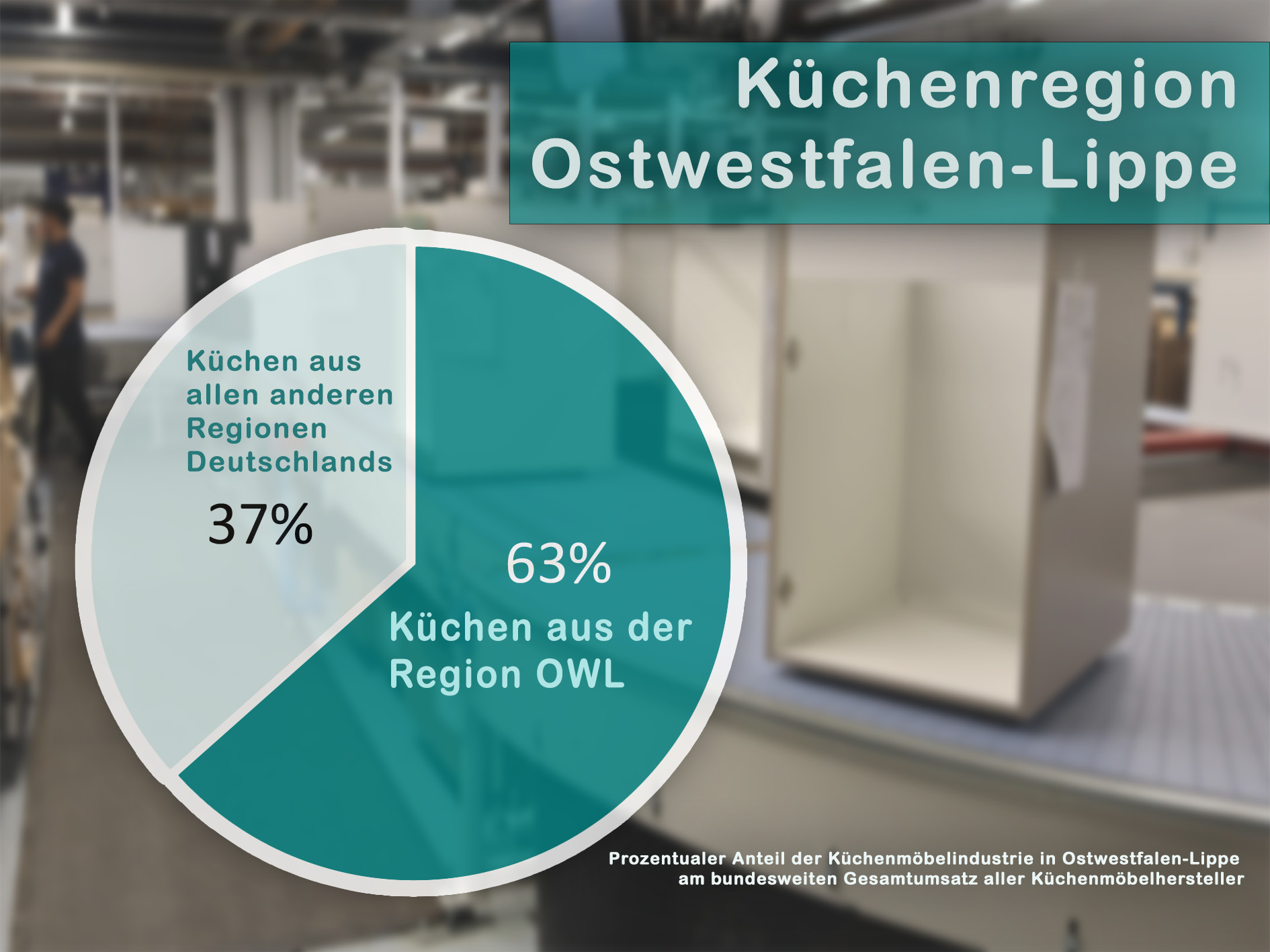 Besonders stark ist die Möbelindustrie in der Region Ostwestfalen-Lippe vertreten. Der Schwerpunkt liegt hier in der Produktion von Küchenmöbeln. Die 28 ansässigen Küchenmöbelhersteller mit ihren rund 10.000 Mitarbeiterinnen und Mitarbeitern setzen im vergangenen Jahr rund 3,6 Milliarden Euro (minus 6,4 Prozent) um. Damit wurden abermals fast zwei Drittel des deutschen Umsatzes des Branchenzweigs Küche in Ostwestfalen-Lippe erwirtschaftet.