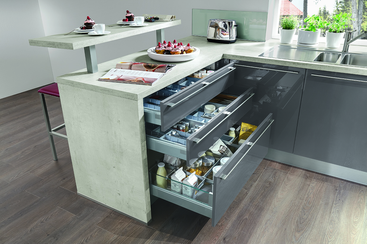 Die große und offene Küche erlaubt neben der Anordnung einer geraden oder gewinkelten Unterzeile gern auch eine Küchentheke, die frei im Raum steht und von allen Seiten zugänglich ist. Unterschiedlich ist heute deren mögliche Ausstattung. Mangels empfiehlt, sich bereits vor dem Bau über die Funktionsbereiche der Küche Gedanken zu machen: „Wenn man vor dem Neubau einplant, dass später das Spülbecken beispielsweise in der Theke seinen Platz finden soll, müssen hier Wasserabfluss und -zulauf schon im Boden intergiert werden“. Auch gibt er zu bedenken, dass immer mehr elektrische Geräte beim Kochen verwendet werden und man daher lieber mehr als zu wenige Stromanschlüsse einplanen sollte. Neben Steckdosen für elektrische Arbeitsgeräte sind auch ausreichend Stromanschlüsse für Lichtquellen und elektrische Schubkastenauszüge einzuplanen. Die energieeffizienten und sich positiv auf die Wohlfühlatmosphäre auswirkenden LED-Leuchtmittel können in einer modernen Küche Arbeitsflächen beleuchten, Sockel verzieren, Oberschränke abschließen, Stauraum in Schubladen oder Oberschränken anstrahlen und vieles andere mehr. Gute Beleuchtung ist gerade für die unterschiedlichen Arbeitsaufgaben in der Küche ein unerlässlicher und professioneller Helfer. Im Übrigen auch in der Kleinraumküche. Hier muss man bei richtiger Planung nicht auf diesen Komfort verzichten. Der Küchenplaner hilft bei der Aufstockung von Elektroanschlüssen gerne professionell weiter. Ordnet man die Geräte den Abläufen richtig zu, kann eine kleine Küche sogar dank ihrer Kompaktheit sehr praktisch sein. Lange Wege entfallen und wenn alles in griffbereiter Nähe ist, kocht sich das Menü in rasanter Schnelligkeit.