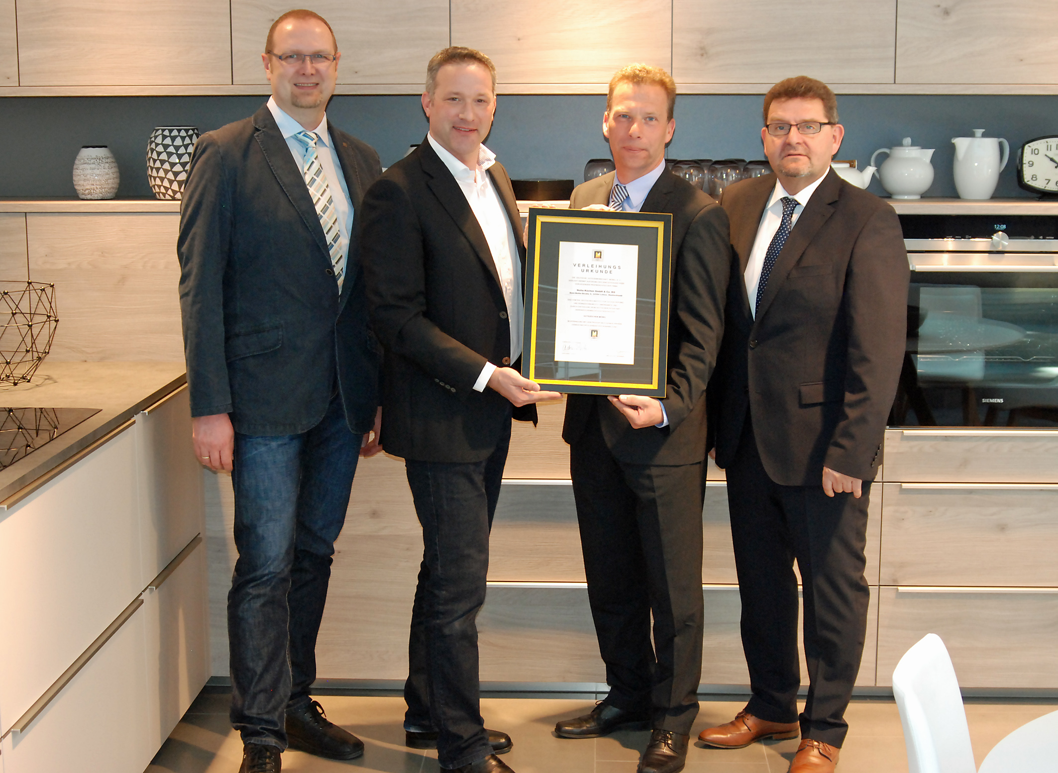 DGM-Geschäftsführer Jochen Winning (2.v.l.) überreicht Marc Hogrebe (Geschäftsführung Nolte Küchen, r.), Dr. Stephan Pühl (Leiter QS, 2.v.r.) und Dipl.-Ing. Frank Bernhardt (QS Produktion, l.) die Urkunde über die DGM-Mitgliedschaft. Foto: DGM