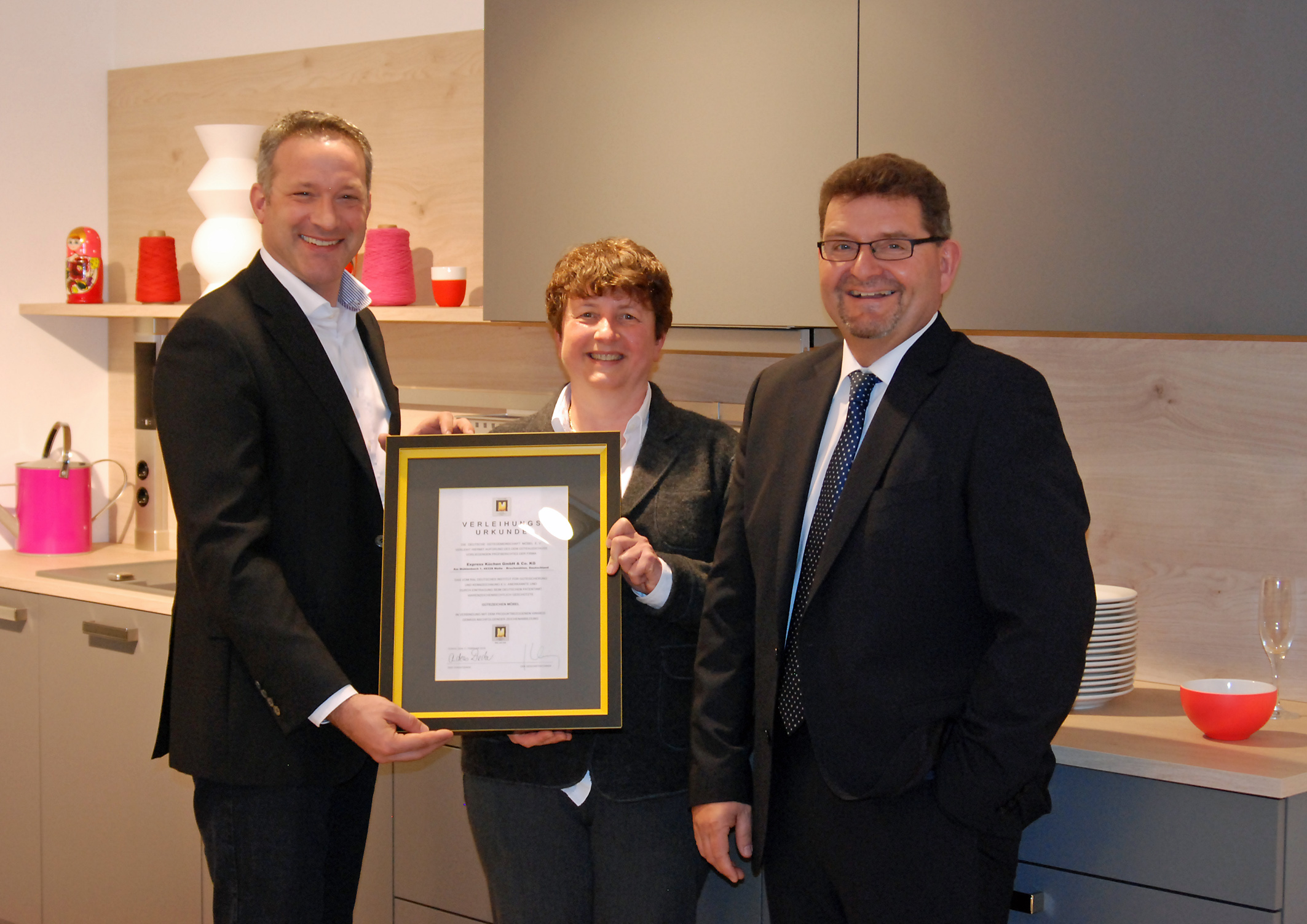 Bild: (v.l.n.r.) DGM-Geschäftsführer Jochen Winning überreicht Kathrin Zaudtke, Qualitätssicherung bei Express Küchen, und Marc Hogrebe, Geschäftsführer von Express Küchen, die Urkunde über die DGM-Mitgliedschaft des Unternehmens. Foto: DGM