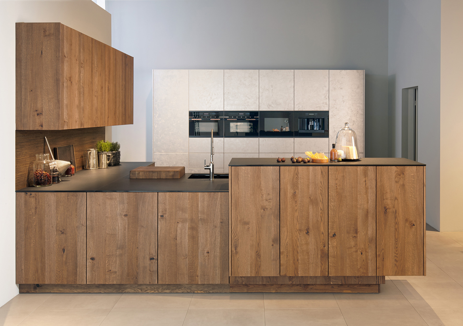 Holz und ausgefallene Materialien wie Beton– oder auch Blattgold-Optik, die sich sehr schön verbinden lassen. Ebenfalls ein Muss: Die hoch eingebauten Elektrogeräte. (Foto: AMK)