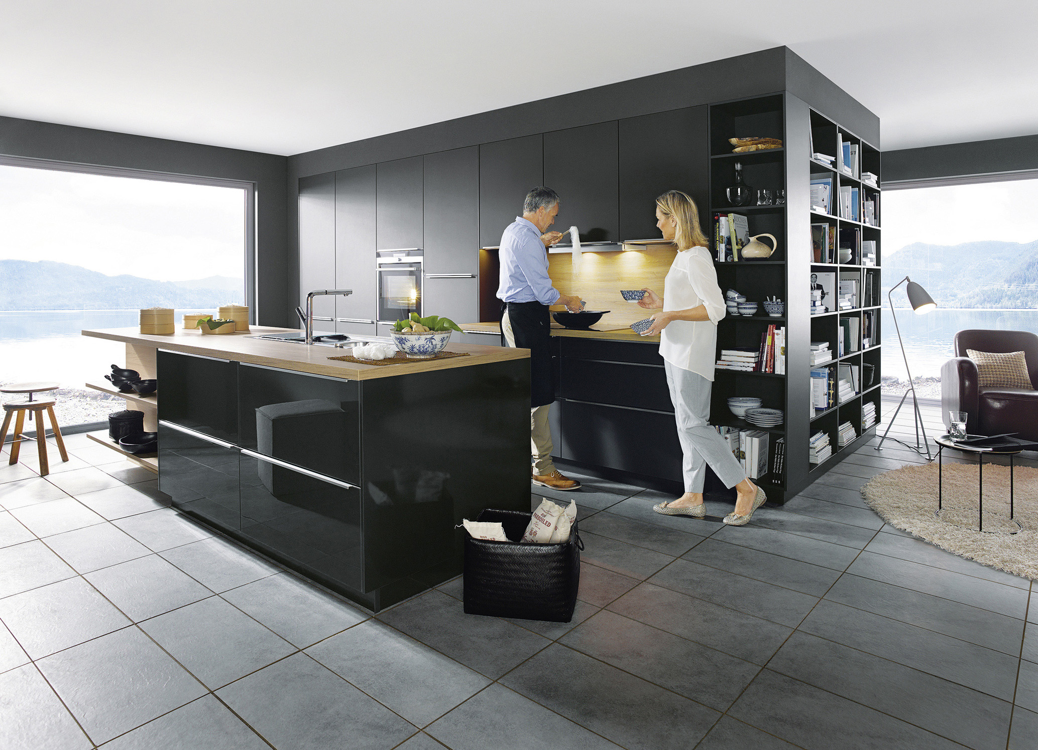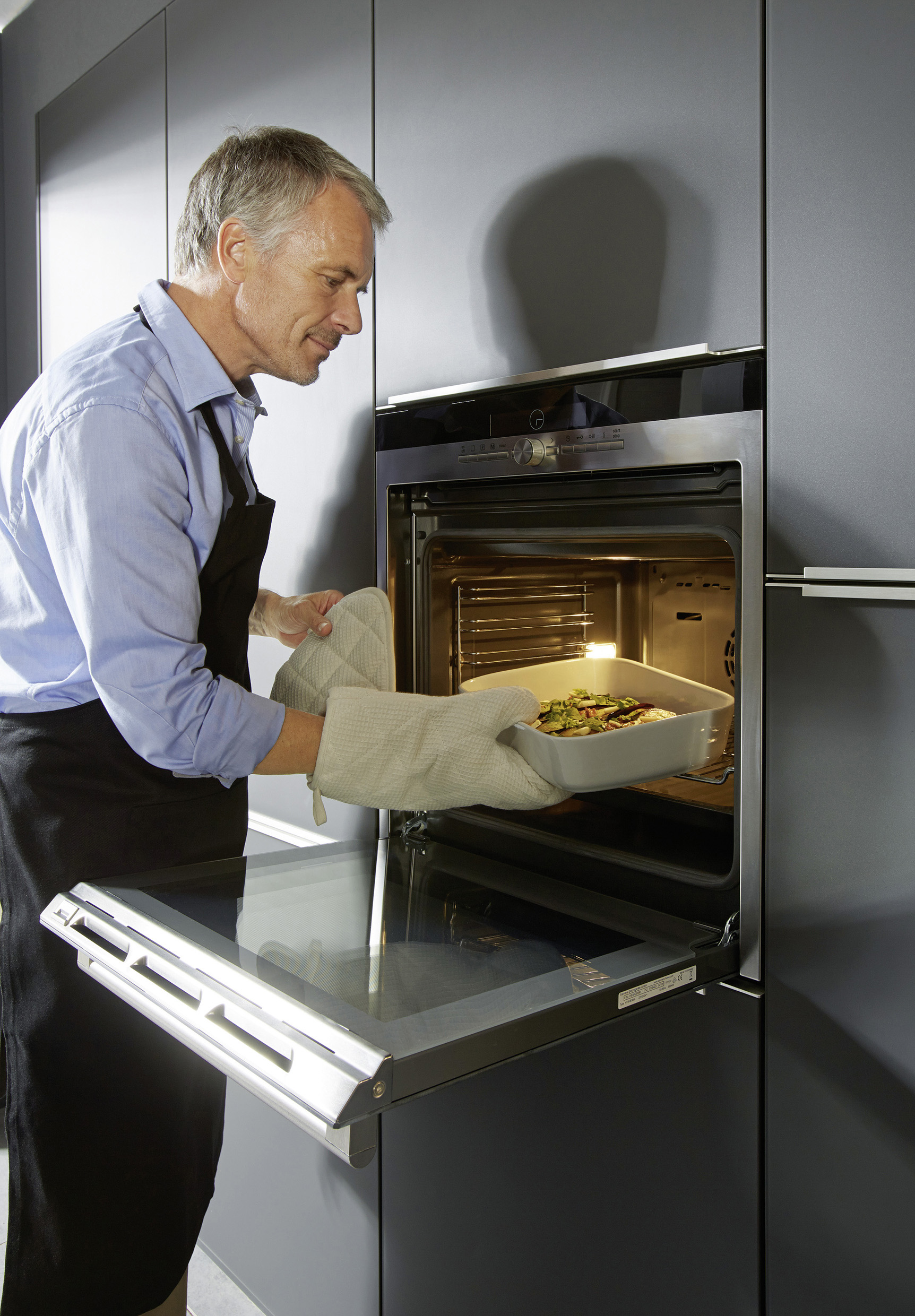 Foto 1 + 1a + 1b: In einer modernen Einbauküche fühlen sich beide Geschlechter wohl, egal ob einzeln oder gemeinsam. Nicht zuletzt durch die neuen technischen Features ändert sich auch immer mehr die klassische Rollenaufteilung. Der Mann kocht und die Frau räumt nach dem Essen den Geschirrspüler ein. (Foto: AMK)