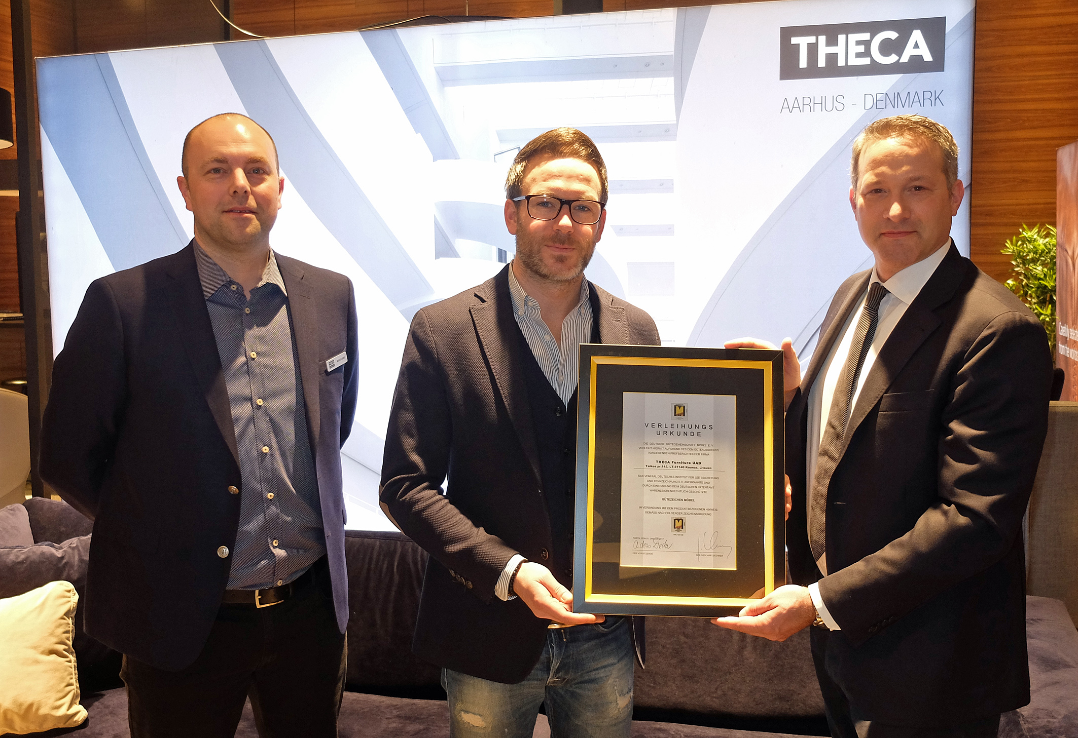 Die Firma Theca wurde im Jahr 2005 von Claus Svenningsen gegründet. Die Polstermöbel werden im dänischen Risskov entwickelt und vertrieben. Produziert werden sie mit etwa 750 Mitarbeitern im Werk in Litauen im Baltikum. Das RAL-Gütezeichen „Goldenes M“ ist das einzig anerkannte Gütezeichen für die umfassende Produktqualität bei Möbeln. Neben den Anforderungen an Qualität, Lebensdauer, Nachhaltigkeit und Funktion wird auch der Bereich „Umwelt und Gesundheit“ durch ein umfassendes Prüfprogramm sichergestellt. Im nationalen wie im internationalen Bereich wird der Nachweis der ausgezeichneten Qualität nun auch durch die Firma Theca Furniture UAB dokumentiert. „Für die Gemeinschaft unserer Qualitätsmöbelhersteller gewinnen wir mit der Firma Theca Furniture UAB einen weiteren starken Hersteller für Polstermöbel“, so DGM-Geschäftsführer Jochen Winning.