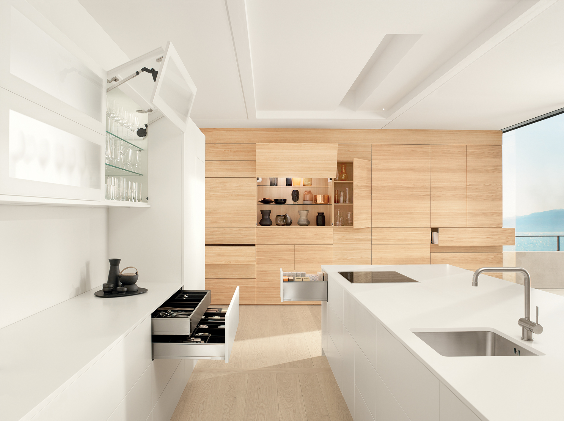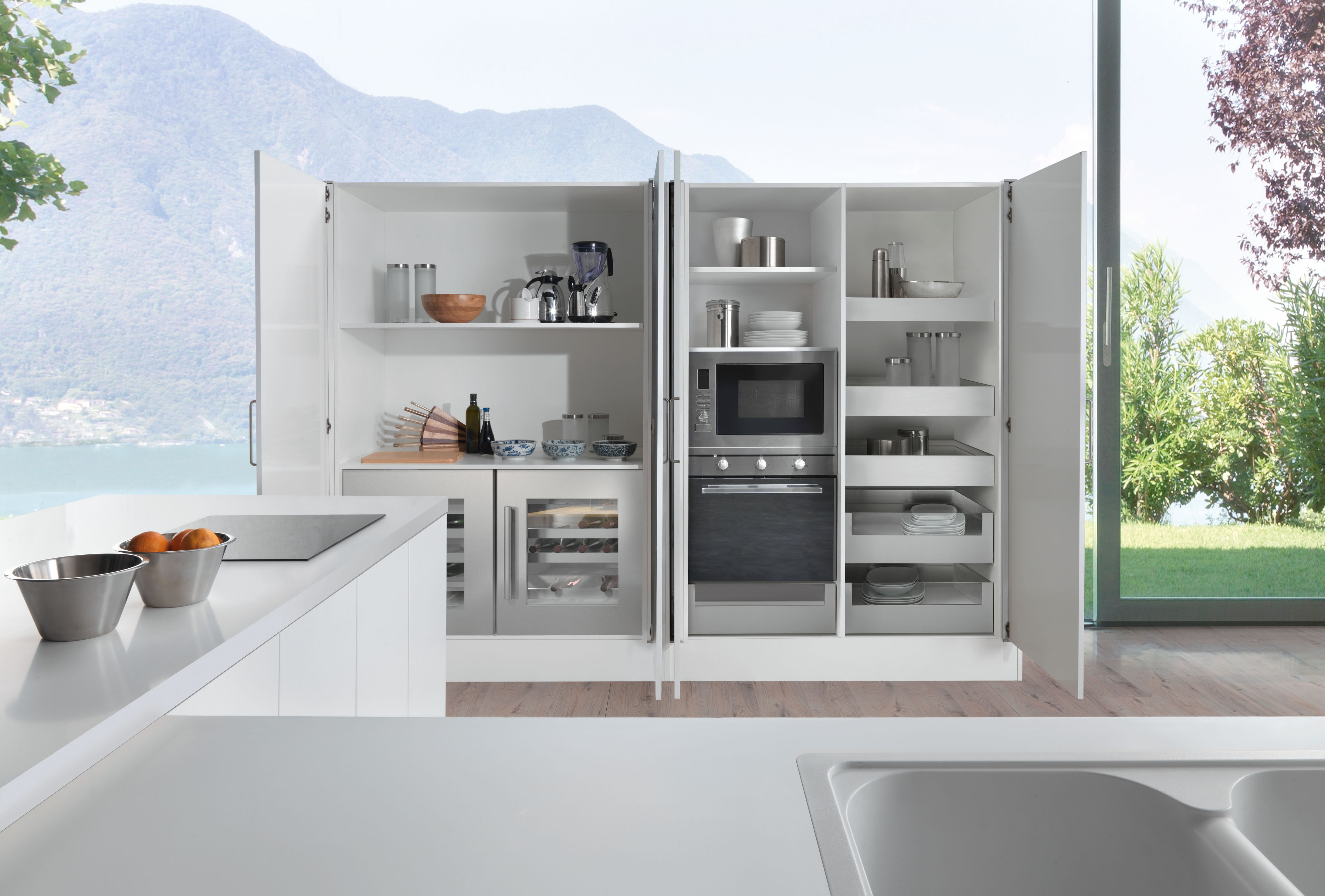 In einer modernen Lifestyle-Wohnküche bewegen sich sämtliche Schubkästen, Auszüge, Klappenschränke, Hoch-, Eck- und Unterschrankauszüge sanft, elegant, schwebeleicht und lautlos – mithilfe von Innovationen wie Selbsteinzug und integrierte Dämpfung, mechanische und elektrische Öffnungsunterstützungen und der Vielfalt an flexiblen Ordnungssystemen. Das macht diese Komfortküchen so begehrenswert.