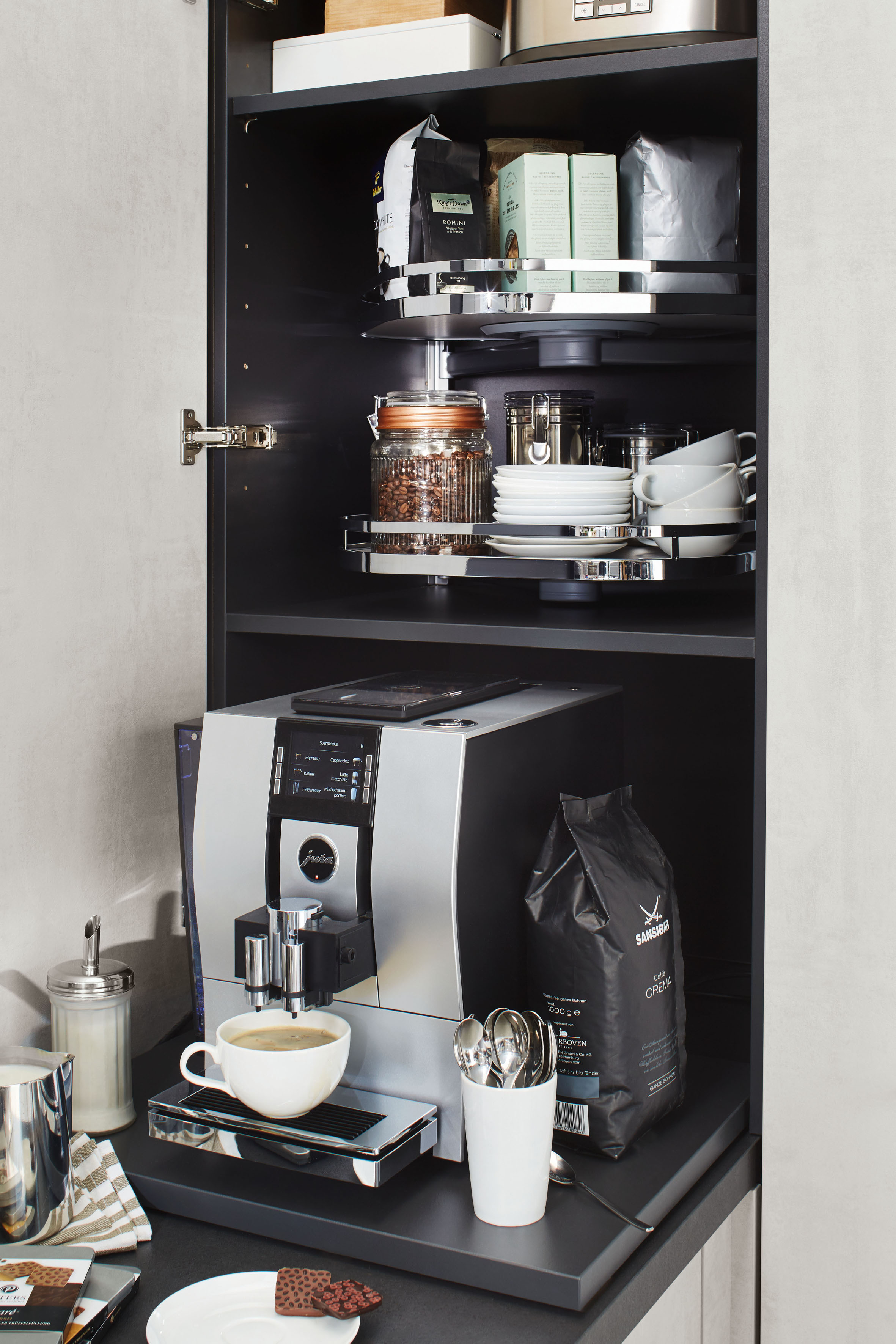 Weitere Beispiele für die faszinierende Welt innovativer Funktionsbeschläge sind Drehkarussells, die sich in einen Hochschrank oder Aufsatzschrank integrieren lassen – auch nachträglich. Damit erfolgt der Zugriff auf den Schrankinhalt (z.B. Espressotassen, Gläser, kleine Porzellanwaren, Gewürze u.v.m.) so viel leichter und angenehmer. Eine andere interessante Komfort¬lösung bietet sich für kompakte Elektro-Kleingeräte an, z.B. den Espresso-Vollautomaten, eine Kaffee- oder Küchenmaschine oder den Thermomix: sie werden auf ausziehbaren Tablarböden in Hoch- oder Aufsatzschränken platziert und lassen sich dadurch leicht und bequem herausziehen. Werden die Geräte nicht mehr benötigt, verschwinden sie wieder hinter der Möbelfront.