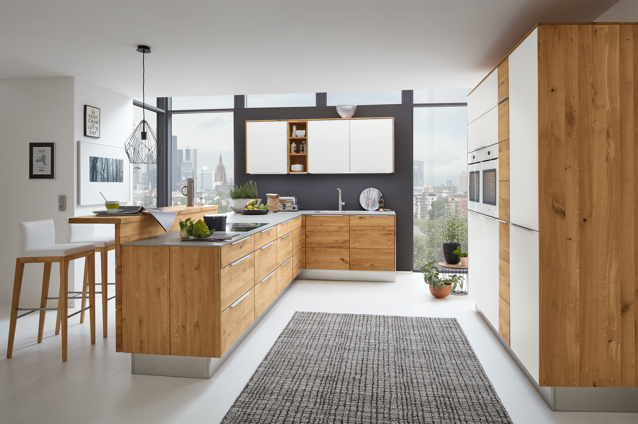 Durch eine spezielle Oberflächenbehandlung mit Wachsen und Ölen kann auch die anfallende Feuchtigkeit beim Kochen den Massivholzmöbeln nichts anhaben. Der Endverbraucher hat die Wahl zwischen einer leicht weißlich eingefärbten Oberfläche und natürlichen Farbtönen der Hölzer. Dementsprechend werden auch unterschiedliche Holzarten angeboten. Wer es schlicht und geradlinig bevorzugt, greift auf die klassische Eiche zurück. Für Typen, die natürliche Holzmerkmale schätzen, kommen Asteiche sowie Kernbuche in Natur und Bianco in Frage. „Alle eingesetzten Hölzer stammen aus PEFC-zertifizierten Wäldern, deren Bestand aktiv und nachhaltig gepflegt wird. Außerdem sind wir als ‚Klimaneutraler Möbelhersteller‘ von der Deutschen Gütegemeinschaft Möbel ausgezeichnet“, erklärt Niehus.
