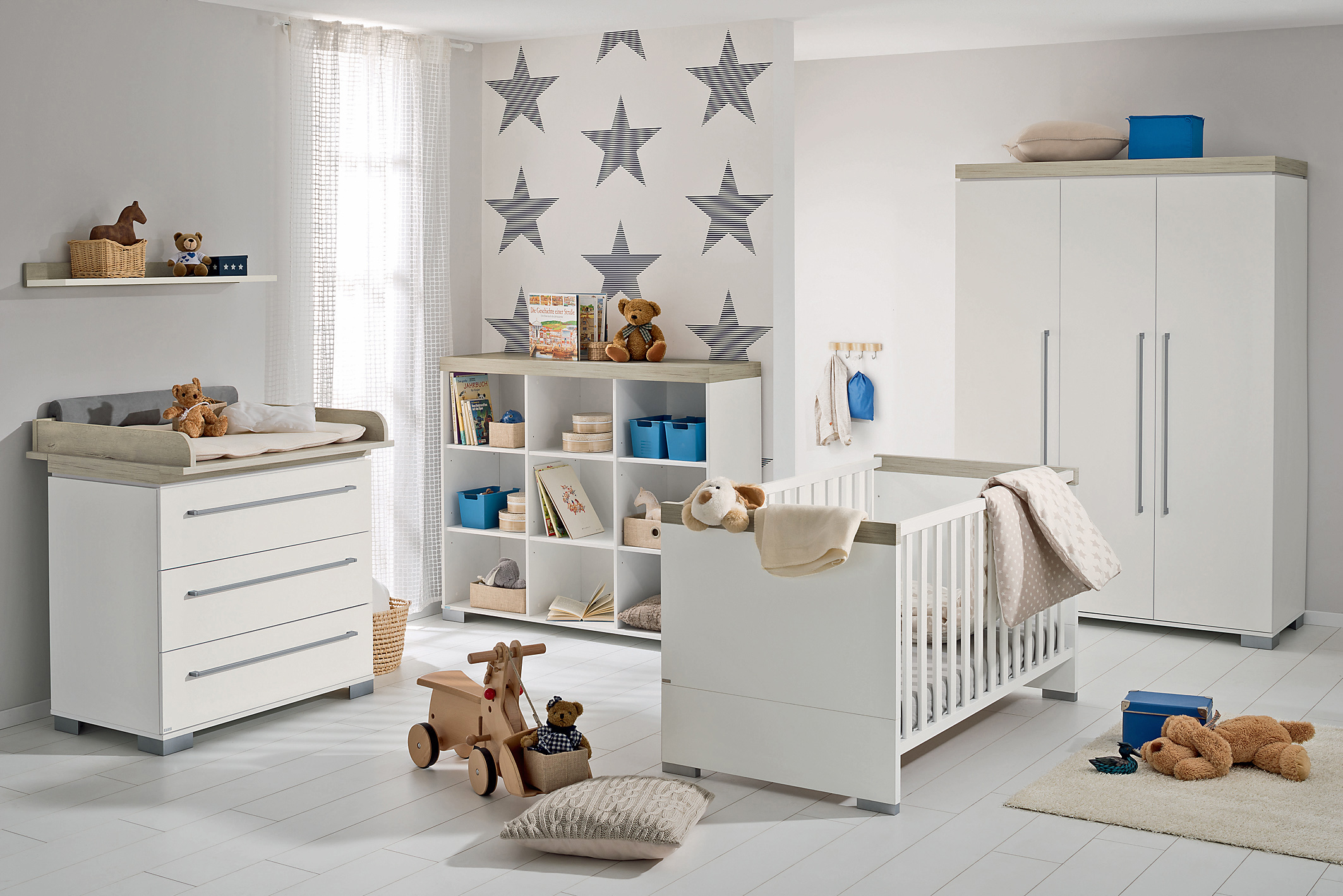 Die Grundausstattung an Möbeln fĂŒr Babys und Kleinkinder sind die Wickelkommode, das Gitterbett und der Hochstuhl. Die Wickelkommode sollte möglichst hohe SeitenrĂ€nder haben. Sie schĂŒtzen das Kind vor dem Herunterfallen. Die Höhe des MöbelstĂŒcks sollte je nach GröĂe der Eltern zwischen 85 und 92 Zentimetern liegen, damit sie das Wickeln in einer rĂŒckenfreundlichen Haltung durchfĂŒhren können.