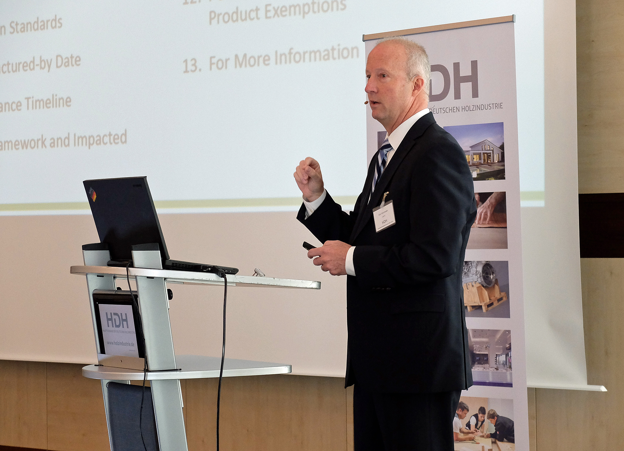 Der erste und am umfassendsten thematisierte Auslandsmarkt auf der Agenda des Symposiums war der US-amerikanische, der der größte außerhalb Europas ist: Ehrengast Erik Winchester, zuständiger Abteilungsleiter bei der US-Umweltbehörde, referierte über veränderte Importbedingungen in Folge der „Formaldehyd Standards for Composite Wood Products“, die als neuer Teil VI in den Toxic Substance Control Act (TSCA) eingefügt wurden. Diese werden ab dem 12. Dezember 2017 für Holzwerkstoffe und Produkte, die diese enthalten, wirksam.