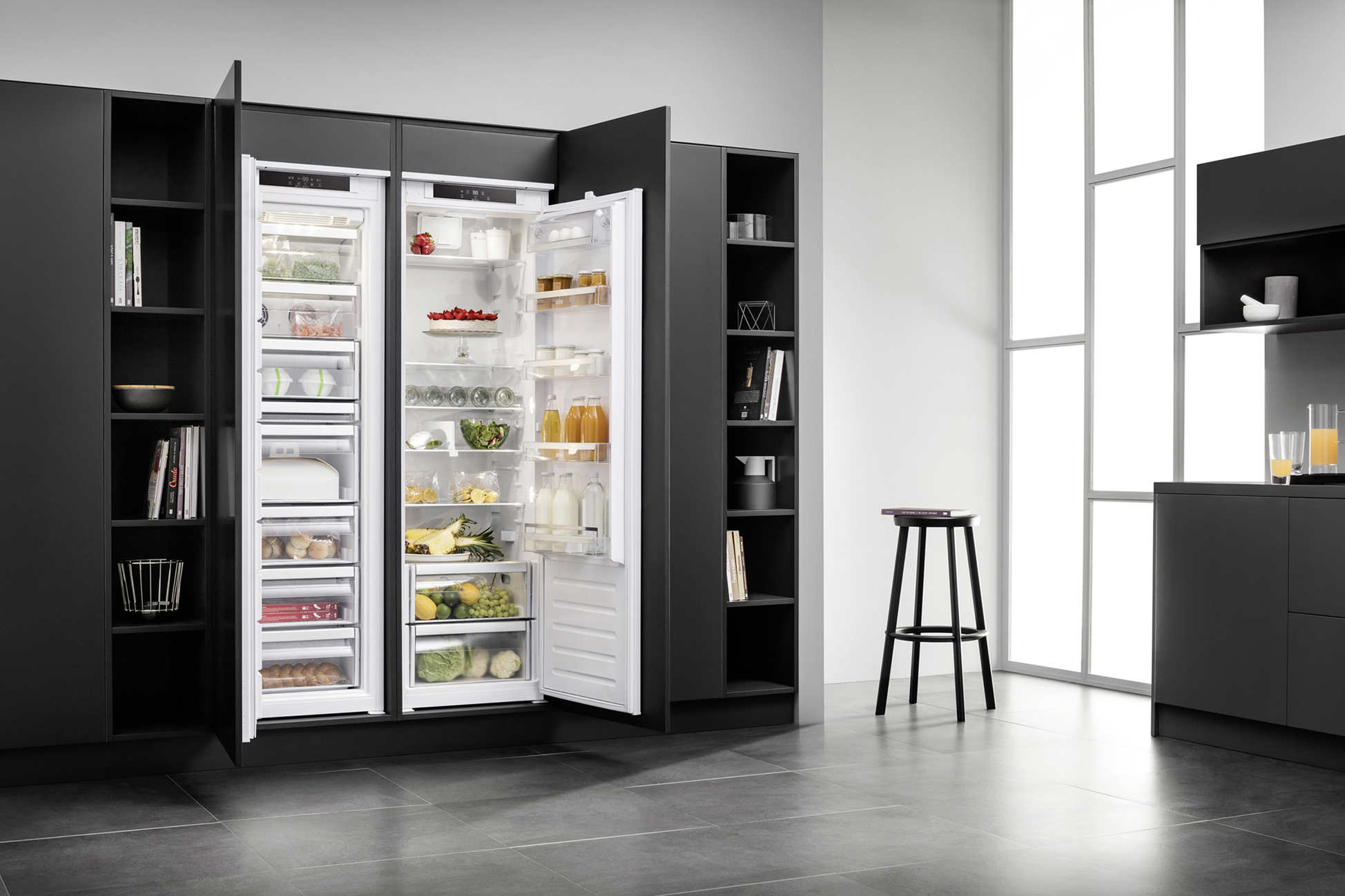 Hier sind ein Kühl- und Gefrierschrank per Verbindungsset Seite an Seite zu einem Einbau-Frischecenter zusammengestellt. Sensoren überwachen und regulieren ständig den Innenraum des Kühlschranks und sorgen so für Idealbedingungen in punkto Luftfeuchtigkeit und Temperatur. (Foto: AMK)