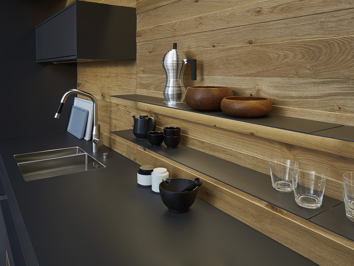 Die Arbeitsplatte ist die meistbeanspruchte Fläche in der Küche. Eine Arbeitsfläche aus echtem Holz, sei es Buche oder Eiche, ist etwas pflegeintensiver als etwa Steinarbeitsflächen, Keramikarbeitsflächen oder solche mit Dekorfolie. Anderseits ist hier das massive Holz ein Sinnbild für Natur und Echtheit. „Massivholzarbeitsflächen werden meist geölt angeboten und sind daher auch wiederstandfähig gegen Feuchtigkeit und Schmutz, müssen aber regelmäßig nachgeölt werden, um das Holz neu zu imprägnieren“, ergänzt Mangels. Massivholz ist ein wohnliches Naturprodukt, bei dem im Laufe der Jahre Gebrauchsspuren und Farb-unterschiede wie eine Patina wirken und den Werkstoff noch ausdruckstärker werden lassen. Buche ist eines der wichtigsten Vollhölzer und neben Eiche auch das gängige Holz für Arbeitsflächen in der Küche.