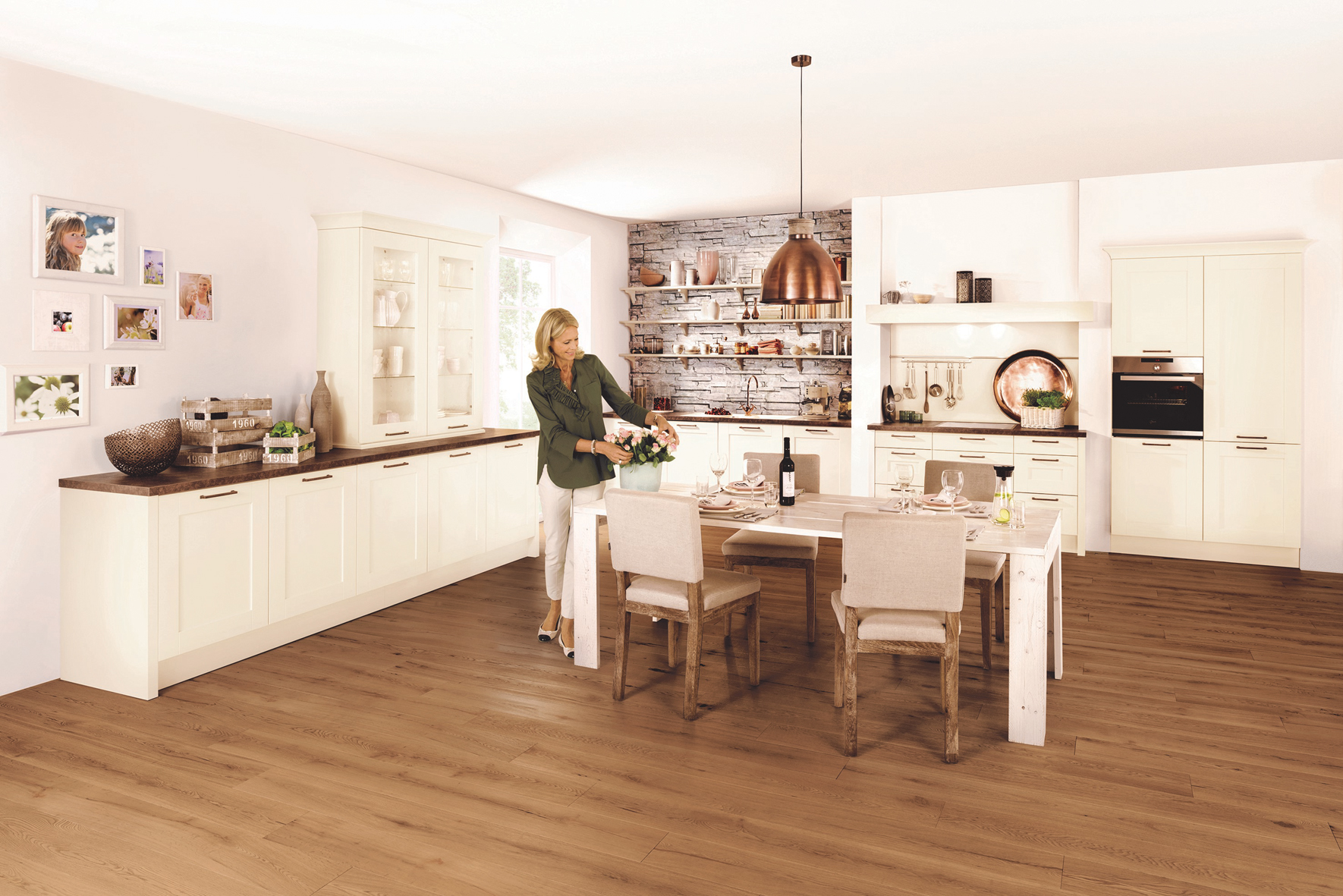 Massivholz und Echtholzfurniere sind optisch abwechslungsreich und vielfältig. Echtes Holz besticht durch seine ureigene Eigentümlichkeit und wirkt von Sorte zu Sorte komplett unterschiedlich. Die helle Buche beispielsweise sieht leicht rötlich und warm aus, die braun gebeizte Eiche eher schwer und fast antik. Die naturbelassene helle Eiche, ein seit einigen Jahren immer beliebter werdendes Holz, wirkt schlicht und elegant. Sie wird heute mit verschiedenen Oberflächenfinishs angeboten wie etwa sägerau, gebürstet, stanzgeprägt, gehobelt, geschliffen oder auch bedruckt. Nussbaum mit seinem dunkelbraunen Farbton ist ein Klassiker unter den Holzarten und bringt stets eine wohnliche Atmosphäre. Das helle Ahornholz mit seinen fast weißen Anklängen wirkt neutral und zurückhaltend. Kirschholz hingegen ist durch seine rötlichen Nuancen auffällig und fein. Jedes Massivholz und jedes Furnier ist einzigartig in seiner Oberfläche. Im Schrankbereich wird echtes Holz heute gerne als Front in Kombination mit Lack oder Glas genommen. „Durch die freie Auswahl der Schrankfronten entsteht eine individuelle Küchenoptik die stets einzigartig ist und daher genau im Trend liegt“, sagt Kirk Mangels weiter.
