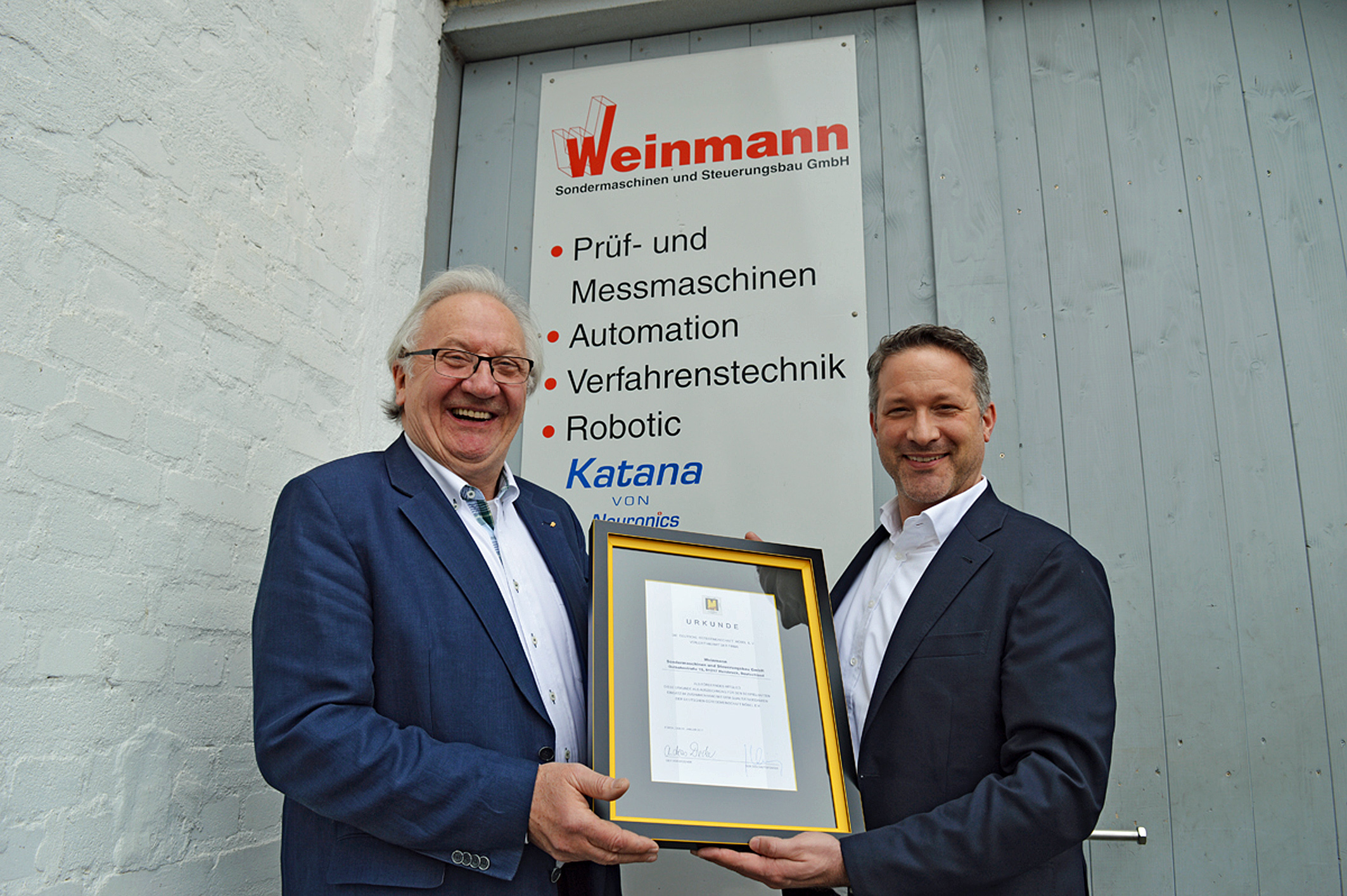 Bild: DGM-Geschäftsführer Jochen Winning (r.) übergibt die Urkunde über die DGM-Fördermitgliedschaft an Peter Weinmann, Geschäftsführer der Weinmann Sondermaschinen und Steuerungsbau GmbH. Foto: DGM