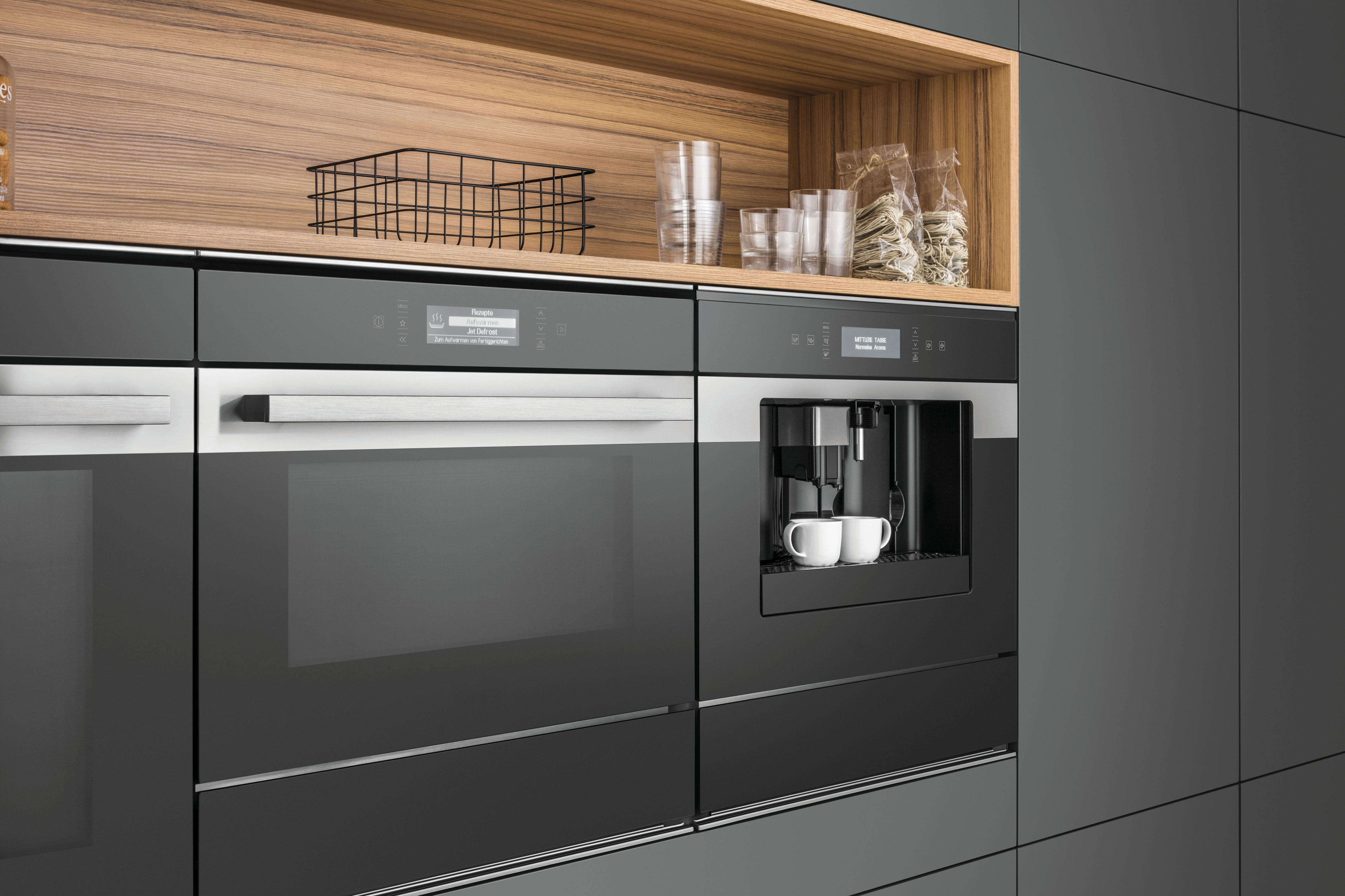 âKaffeevollautomaten, ergonomisch in Sicht- und bequemer Bedienhöhe eingebaut, sind ein Gewinn in jeder KĂŒcheâ, sagt Volker Irle. Entweder als schickes Solo-EinbaugerĂ€t fĂŒr eine 45 cm hohe Möbelnische oder zusammen mit anderen KompaktgerĂ€ten in einer Reihe neben- oder ĂŒbereinander eingebaut (z. B. zusammen mit einem Kompakt-Backofen und -Dampfgarer). Sollte Platz fĂŒr eine 60-cm-Nische sein, dann in Kombination mit einer attraktiven WĂ€rmeschublade direkt unter dem Vollautomaten. Darin lassen sich dann, ganz nach Barista-Expertise, die Kaffeetassen und GlĂ€ser stilvoll vorwĂ€rmen.