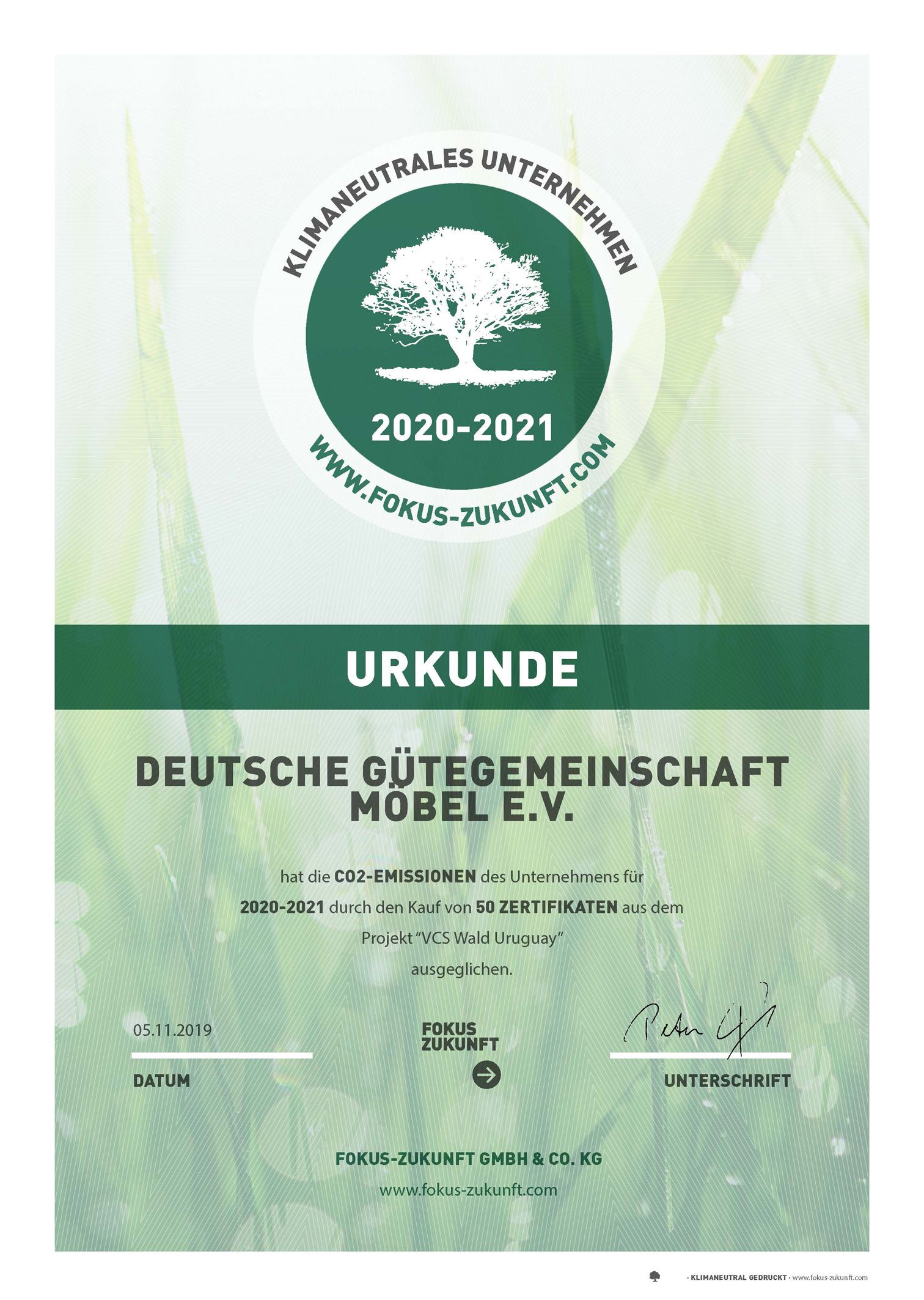 Bild: Die Urkunde über die Klimaneutralität der DGM-Geschäftsstelle. Grafik: DGM