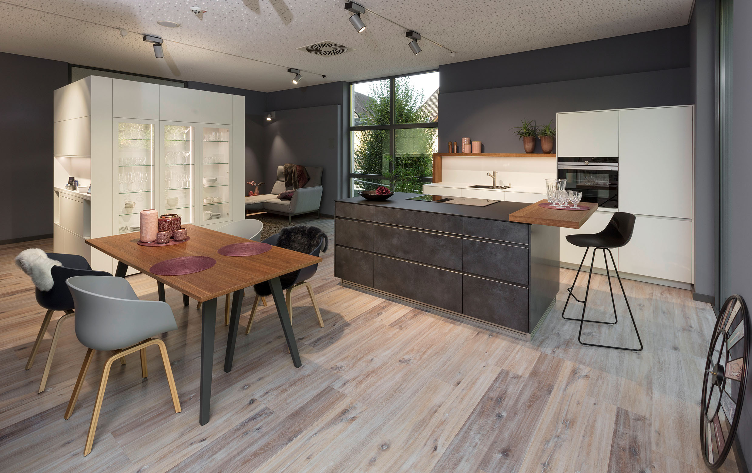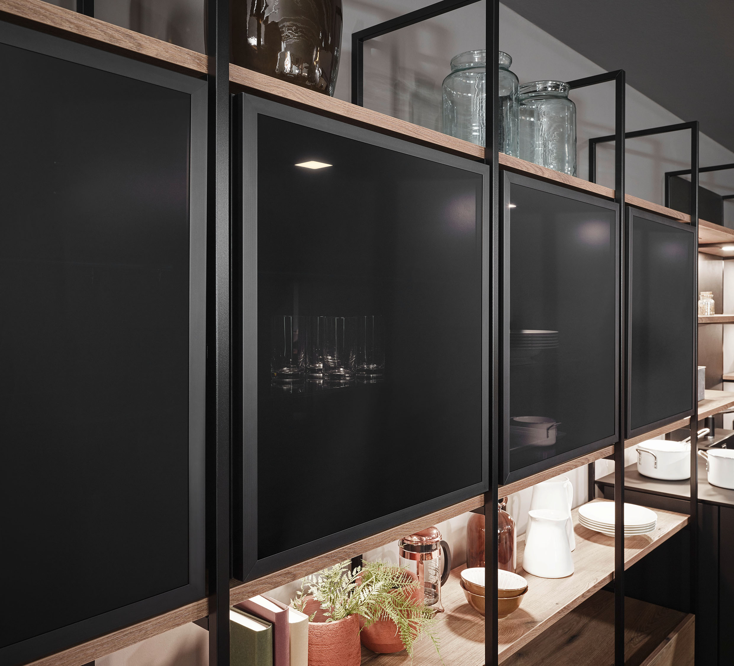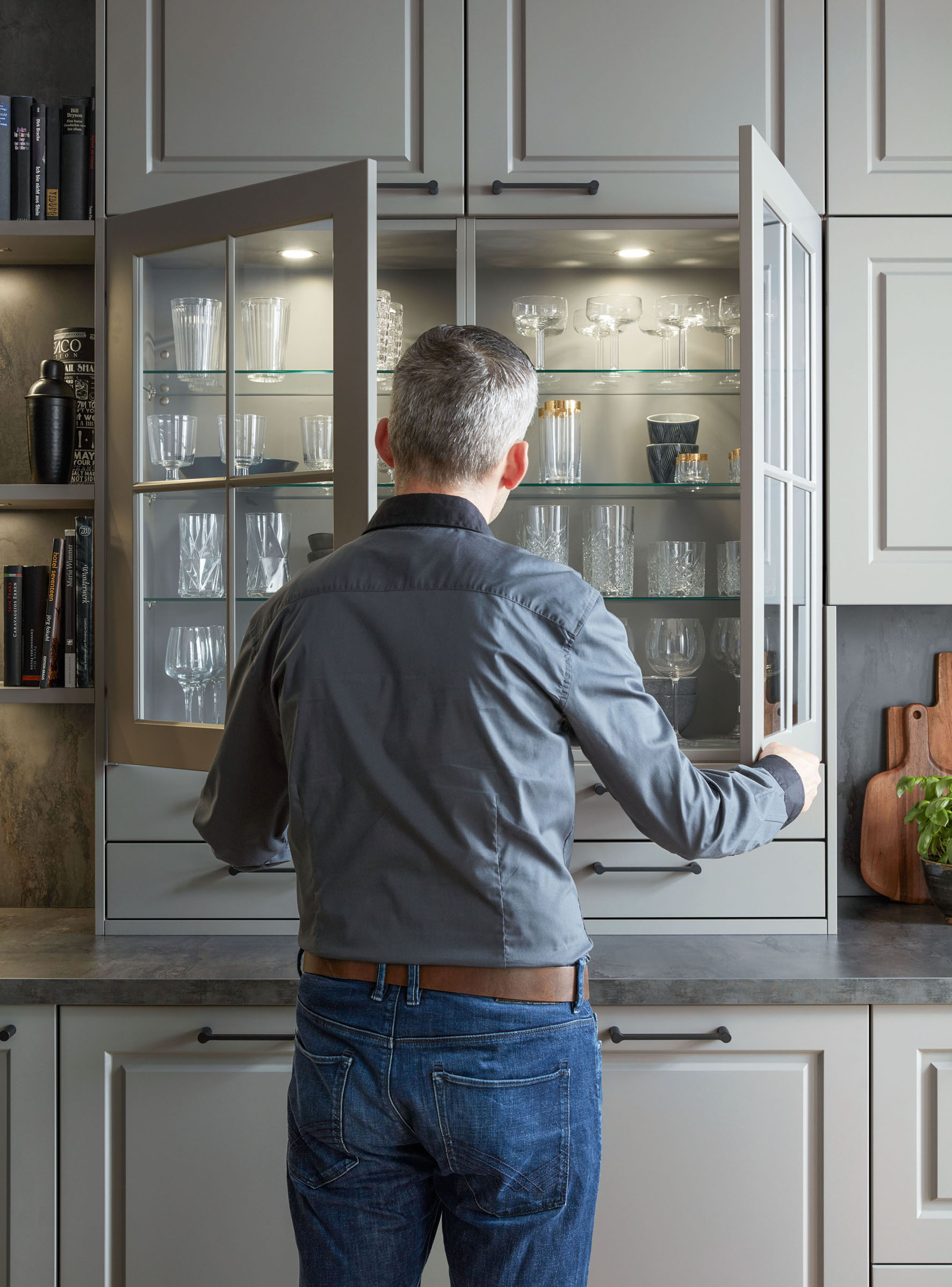 Sollen in der neuen Wohnküche Leichtigkeit und Transparenz vorherrschen, dann lassen sich mit mehreren Vitrinenschränken mit Klarglas sehr schöne Akzente setzen. An die luxuriösen und hochkarätigen Auslagen von Juweliergeschäften erinnern beispielsweise in Dusty Colours geplante Lifestyle-Küchen, deren dunkle Fronten durch beleuchtete Glasschränke das finale gestalterische i-Tüpfelchen bekommen.