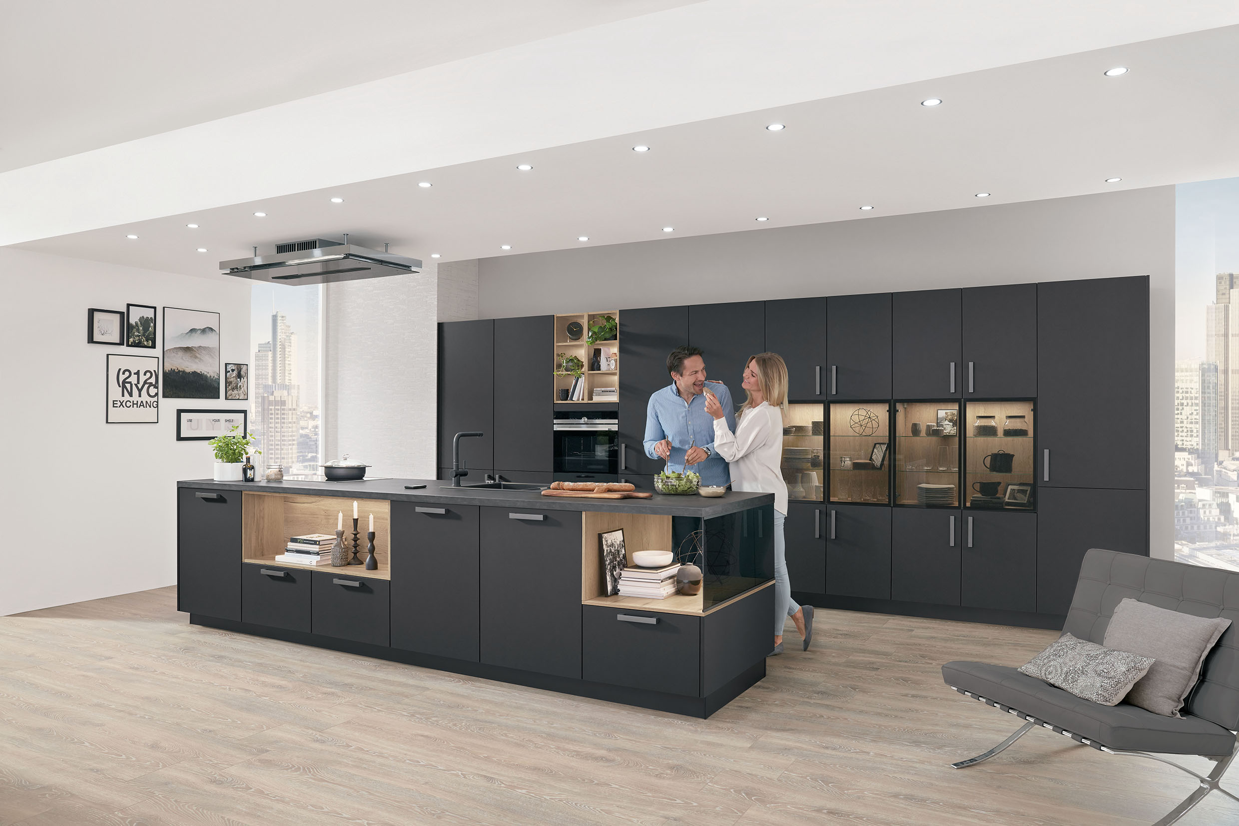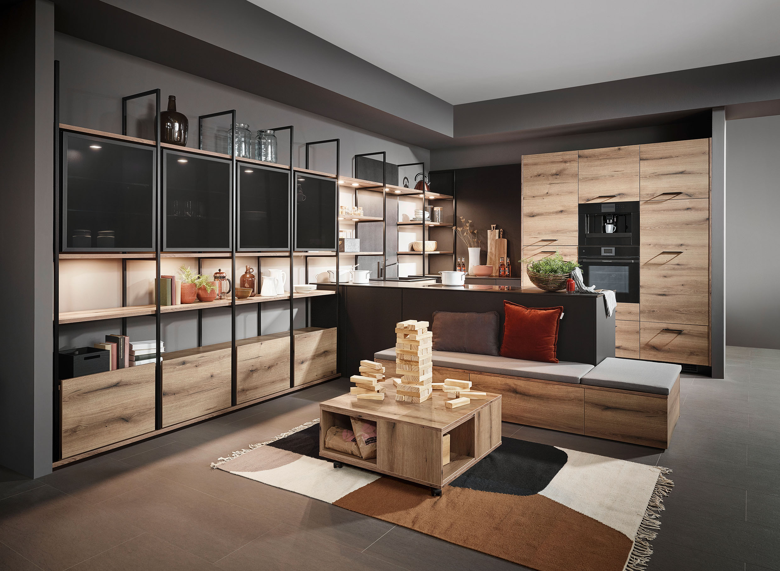 In dieser einladenden, markanten Wohnküche wurden die dunklen Vitrinen in ein Design-Regalsystem integriert. Dabei entstehen fließende und harmonische Übergänge von einem Bereich in den nächsten. (Foto: AMK)
