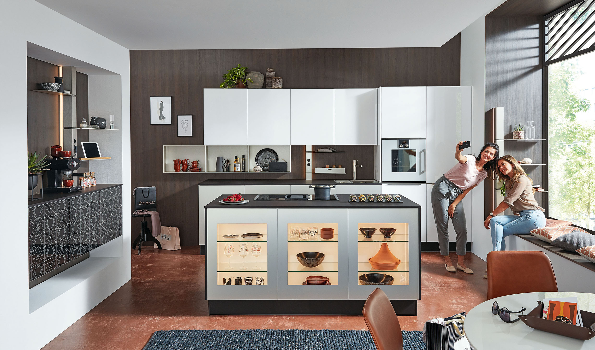 Zeitlose Ästhetik, Stil und Lebensart strahlt diese Lifestyle-Küche aus. Ein toller Blickfang ist die Kücheninsel mit ihren beleuchteten Vitrinen und dekorativen Auslagen, die sich immer wieder neu inszenieren lassen. (Foto: AMK)