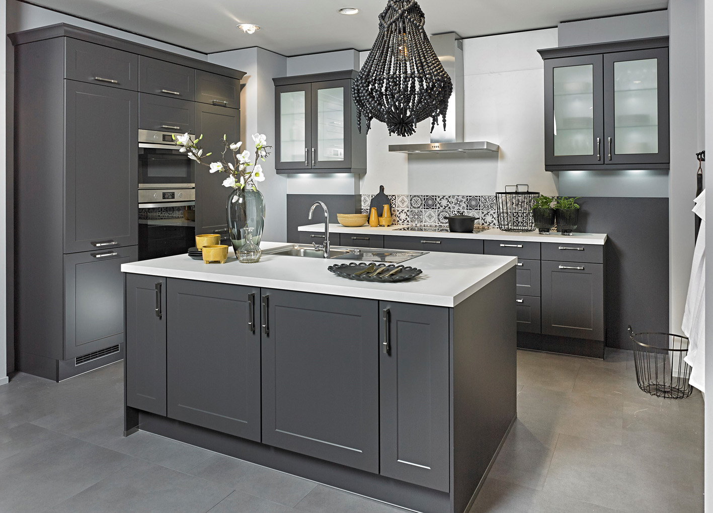 Ein Eyecatcher in dieser eleganten Wohnküche mit Rahmenfronten in samtmattem Grau ist die beleuchtete, auf der Arbeitsplatte aufgesetzte Vitrine mit komfortabel ausgestatteten Schüben direkt darunter. (Foto: AMK)