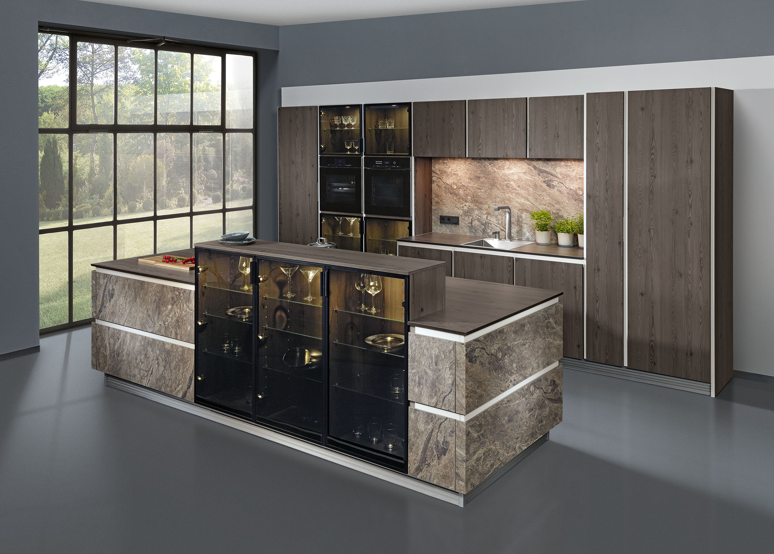 Was Glasschränke so spannend und faszinierend macht: So manches hochwertige Porzellan, schöne Gläser und dekorative Accessoires in der Wohnküche sind einfach viel zu schade, um sie hinter intransparenten Fronten aufzubewahren. Das andere ist das reizvolle, kreative Spiel mit verschiedenen Stilarten und Materialien: In Echtholz gerahmte Glastüren mit Sprossen erinnern an bezaubernde, stilecht geplante Landhausküchen. Wird ein markanter Look, vielleicht im rauen Industriestil präferiert, kommen die Vitrinen mit schwarz eloxierten Metallrahmen und wirken so schön „heavy“. In einer eleganten, repräsentativen Lifestyle-Wohnküche finden grifflose Vitrinentüren mit bronzefarben getöntem Glas ihre perfekte und würdige Ergänzung in ebenso lackierten Rahmen.