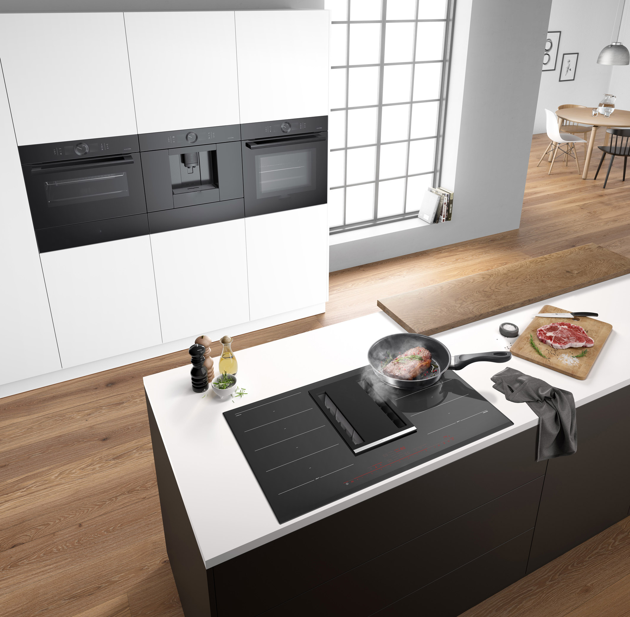 Foto 6: Trennung mit Verstand: Modernes Kochfeld mit integriertem Dunstabzug und ein hoch eingebauter Backofen. (Foto: AMK)